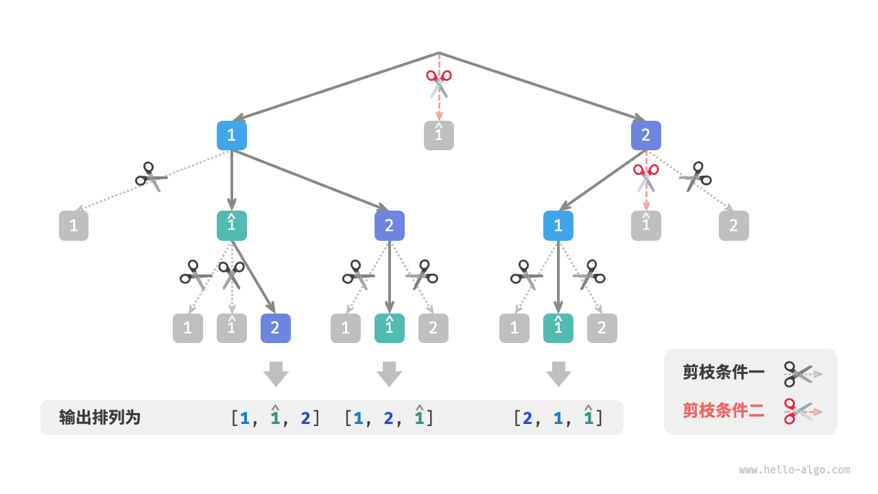 那么如何去除重复的排列呢?最直接地,考虑借助一个哈希集合,直接对排列结果进行去重。然而这样做不够优雅,因为生成重复排列的搜索分支没有必要,应当提前识别并剪枝,这样可以进一步提升算法效率。