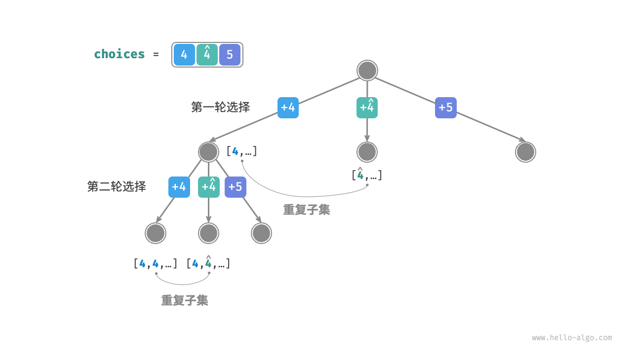 相比于上题,本题的输入数组可能包含重复元素,这引入了新的问题。例如,给定数组 \([4, \hat{4}, 5]\) 和目标元素 \(9\) ,则现有代码的输出结果为 \([4, 5], [\hat{4}, 5]\) ,出现了重复子集。