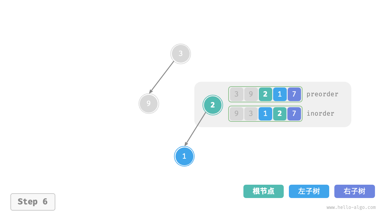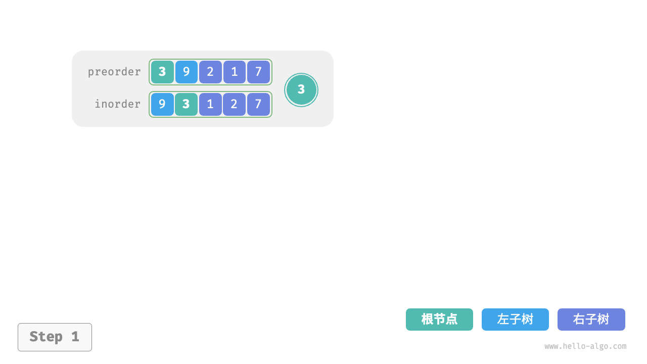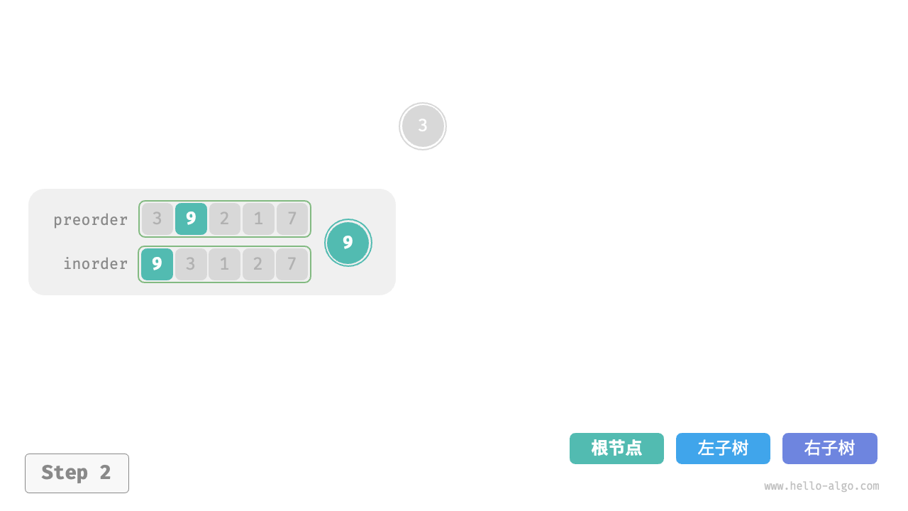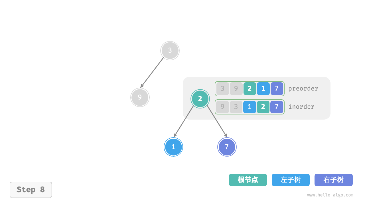 inorder的划分结果,易得左子树和右子树的节点数量分别为 1 和 3 ,从而可将preorder划分为[ 3 | 9 | 2 1 7 ]。