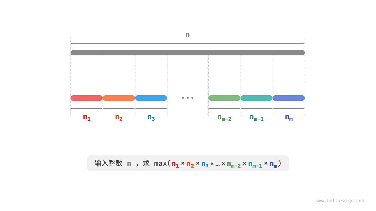 给定一个正整数 \(n\) ,将其切分为至少两个正整数的和,求切分后所有整数的乘积最大是多少,如图 15-13 所示。