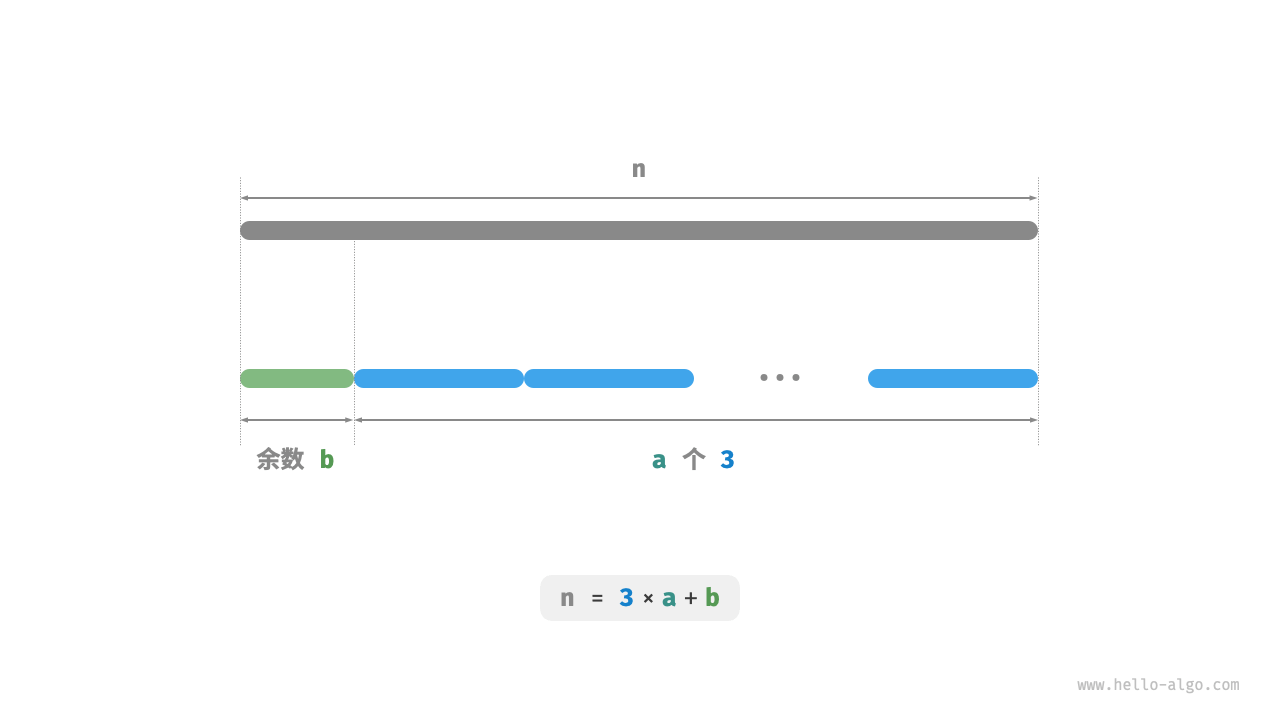 如图 15-16 所示,我们无须通过循环来切分整数,而可以利用向下整除运算得到 \(3\) 的个数 \(a\) ,用取模运算得到余数 \(b\) ,此时有: