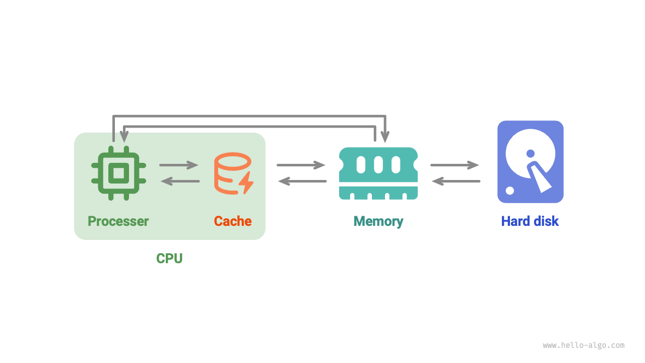 As shown in Figure 4-10, during program execution, data is read from the hard disk into memory for CPU computation. The cache can be considered a part of the CPU, smartly loading data from memory to provide fast data access to the CPU, significantly enhancing program execution efficiency and reducing reliance on slower memory.