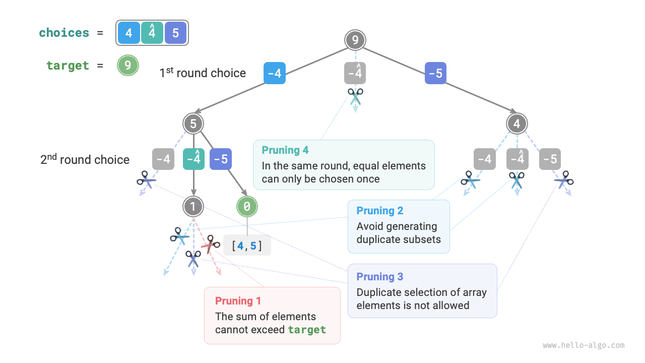 Figure 13-14 shows the backtracking process for the array \([4, 4, 5]\) and target element \(9\), including four types of pruning operations. Please combine the illustration with the code comments to understand the entire search process and how each type of pruning operation works.