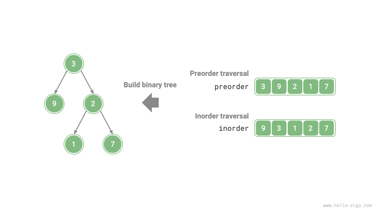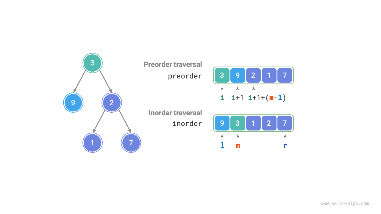inorder, it is easy to determine the number of nodes in the left and right subtrees as 1 and 3, respectively, thus dividingpreorderinto[ 3 | 9 | 2 1 7 ].