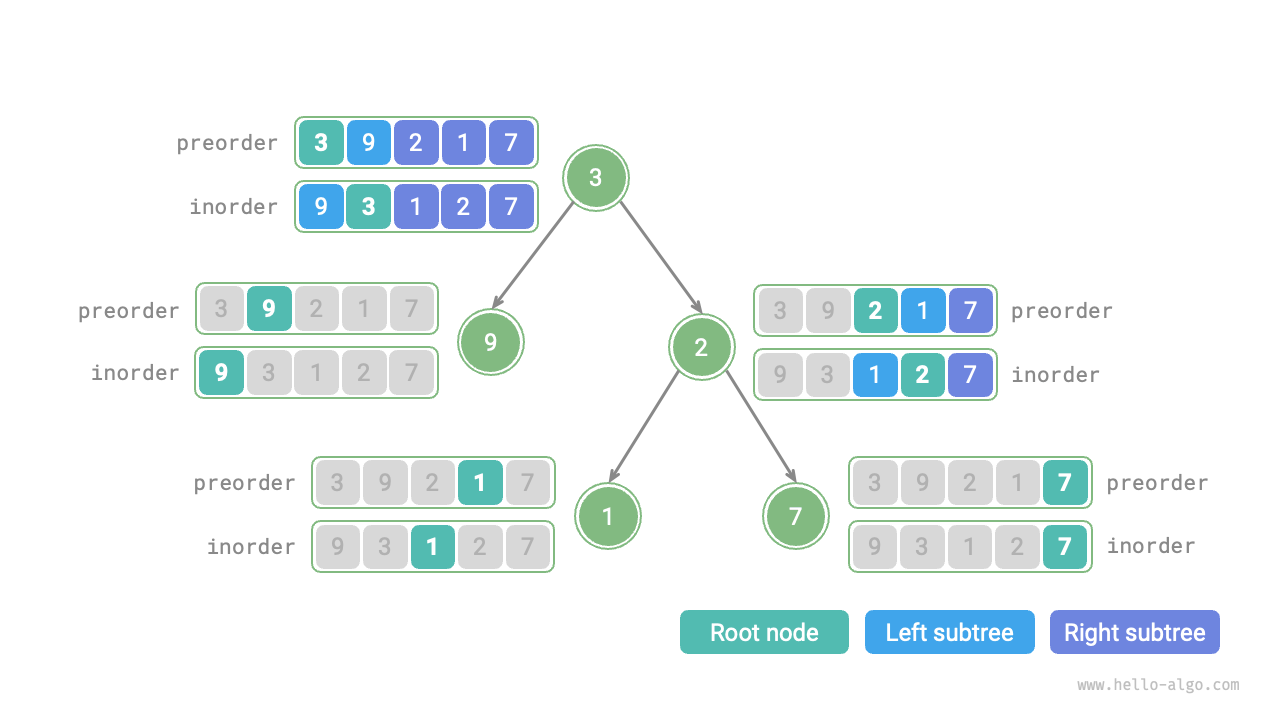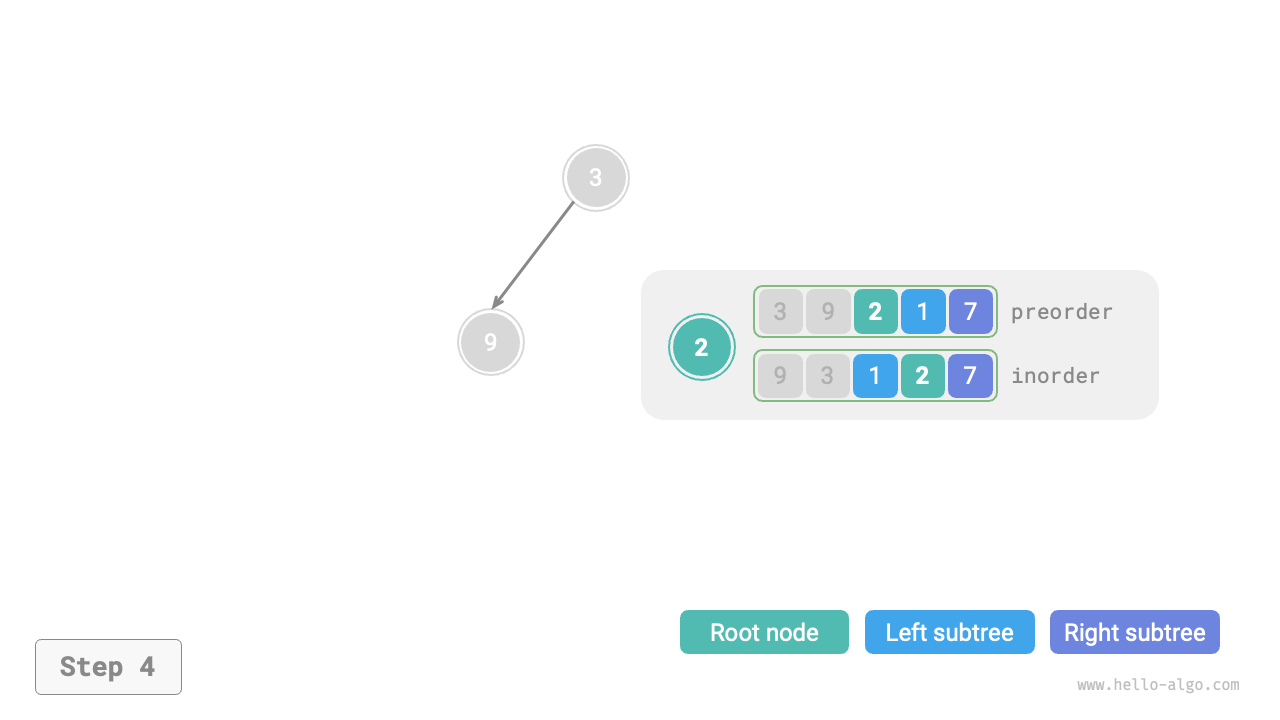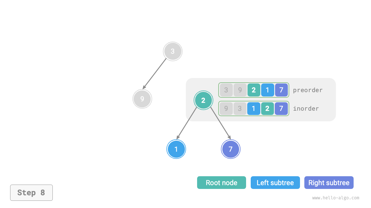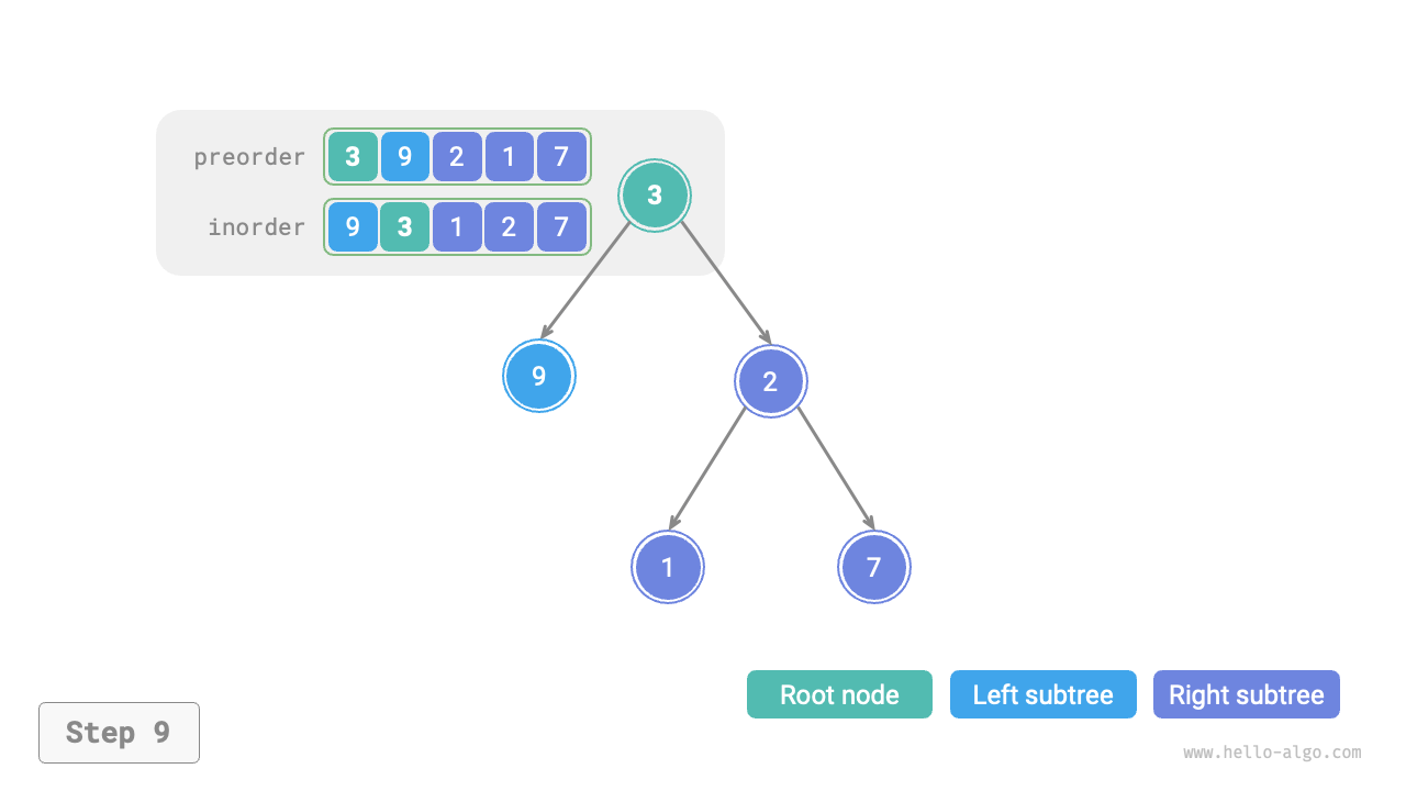 inorder, and use this index to divideinorderinto[ 9 | 3 | 1 2 7 ]. - Based on the division results of