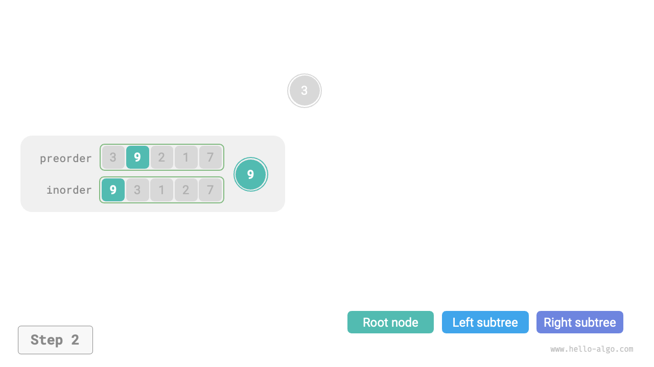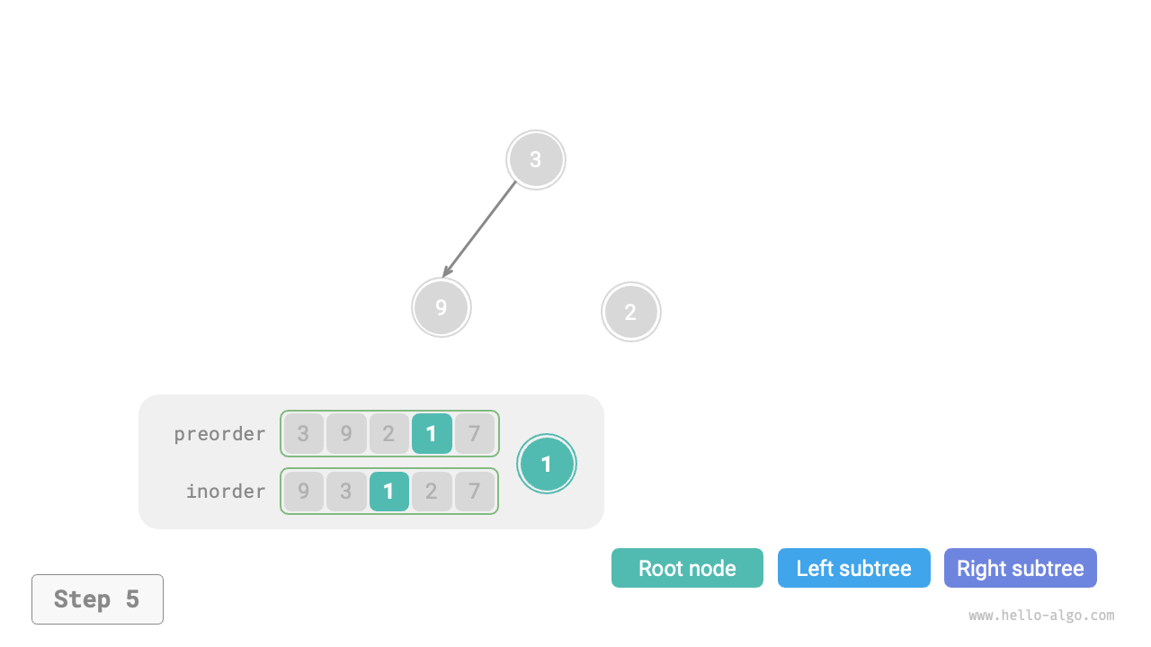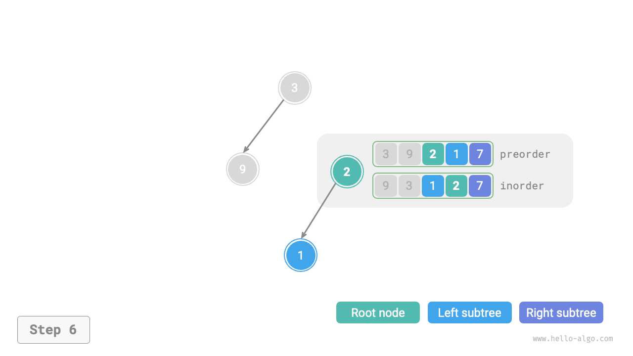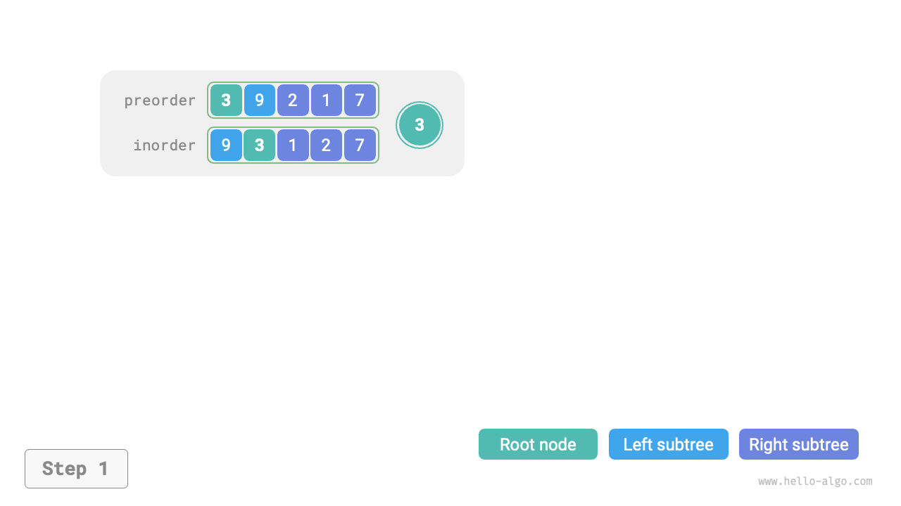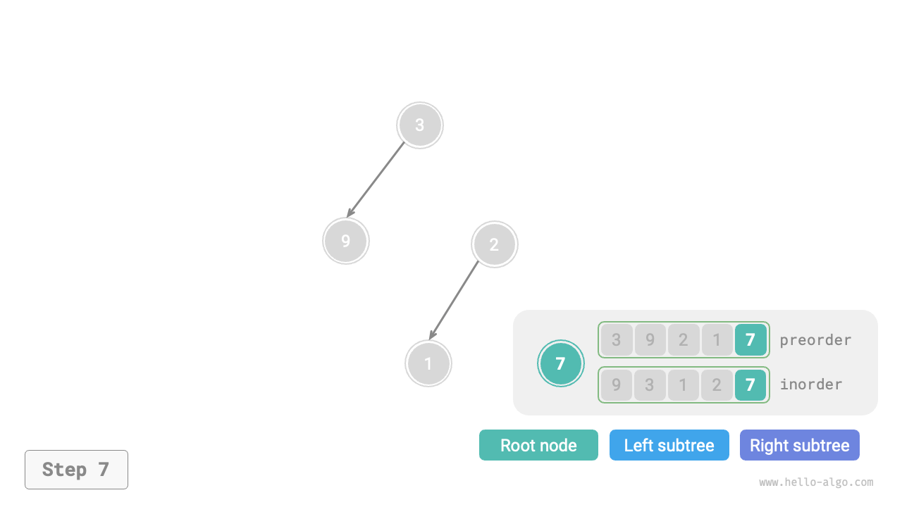 inorder, and use this index to divideinorderinto[ 9 | 3 | 1 2 7 ]. - Based on the division results of