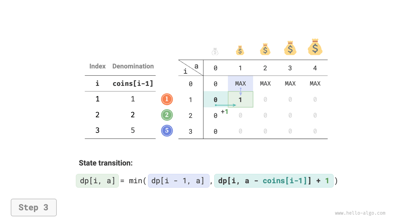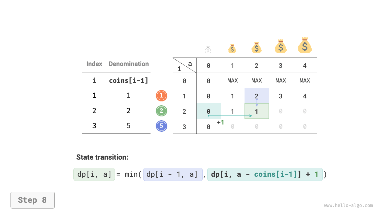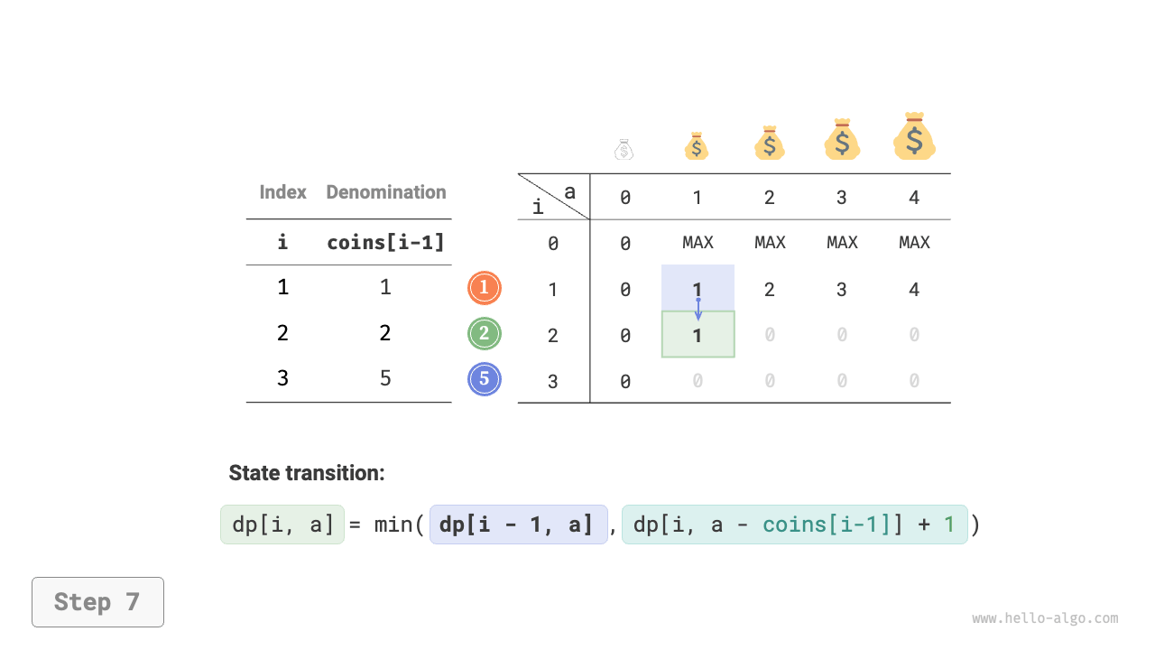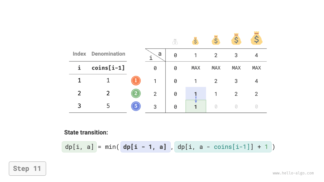- The optimization is focused on the number of coins, so simply add \(+1\) when a coin is chosen.