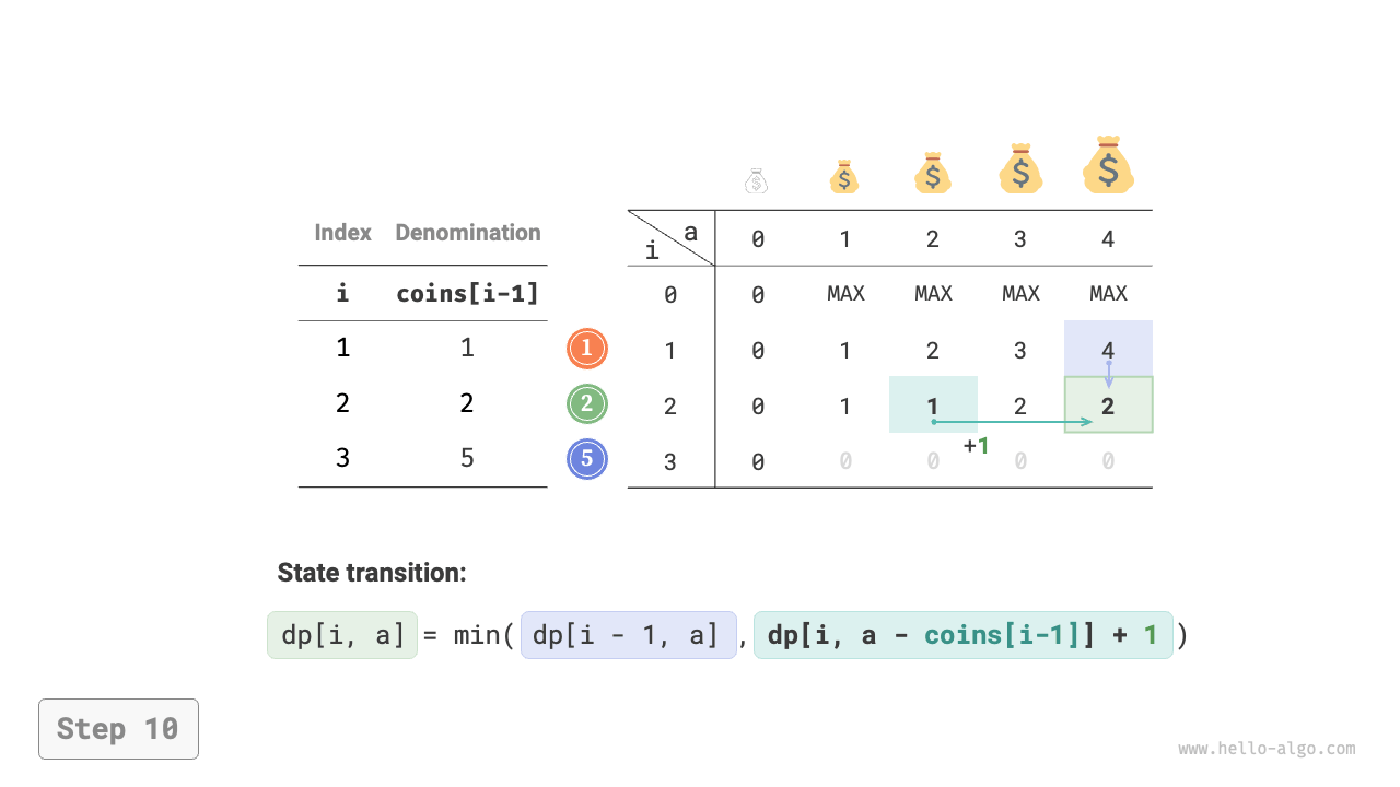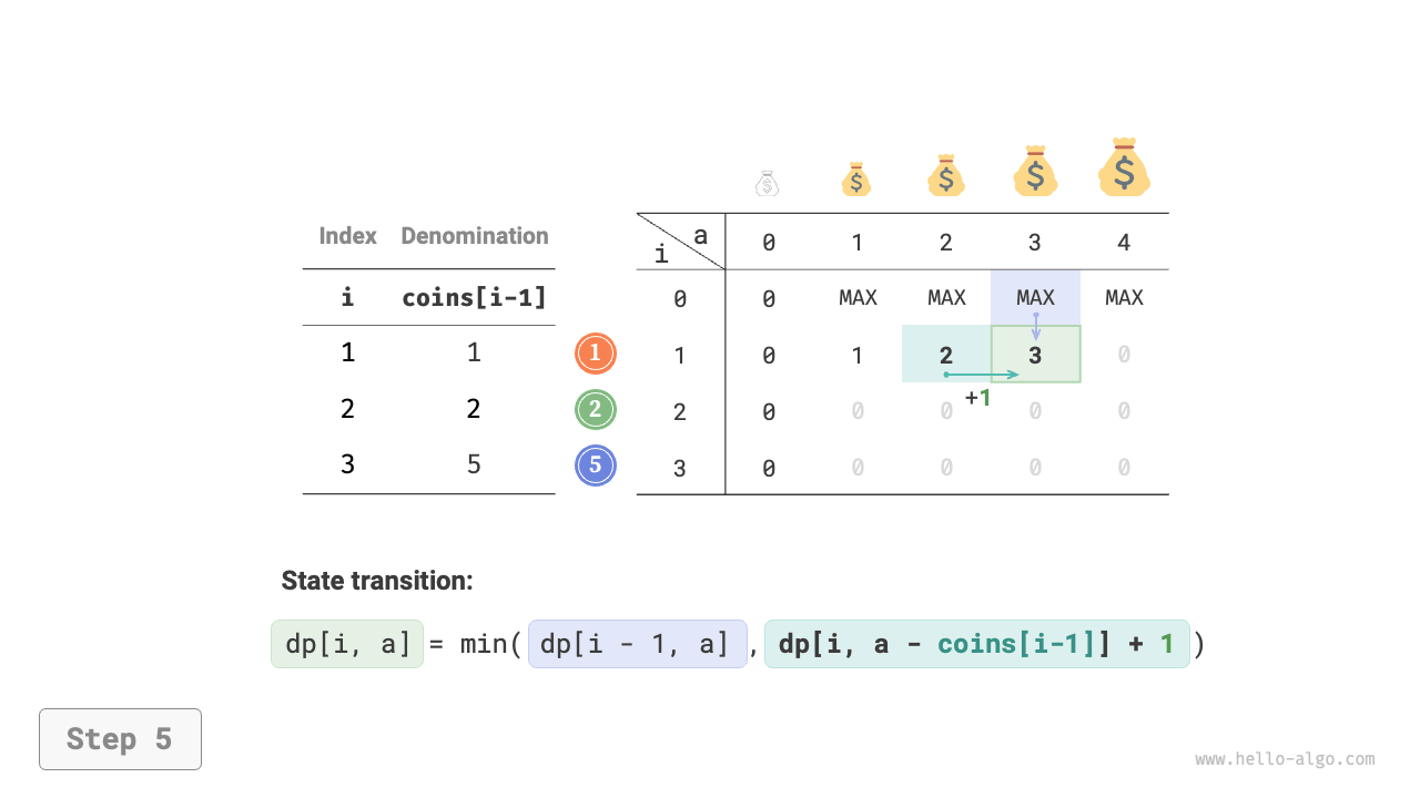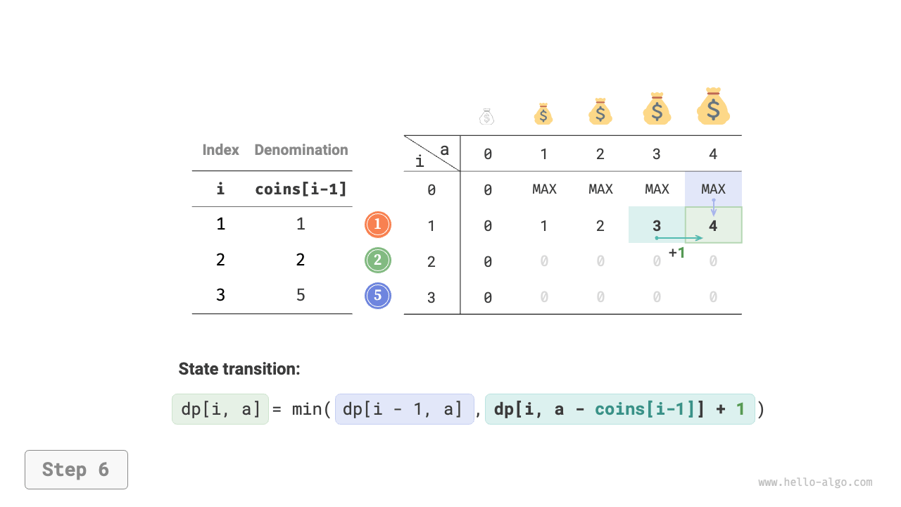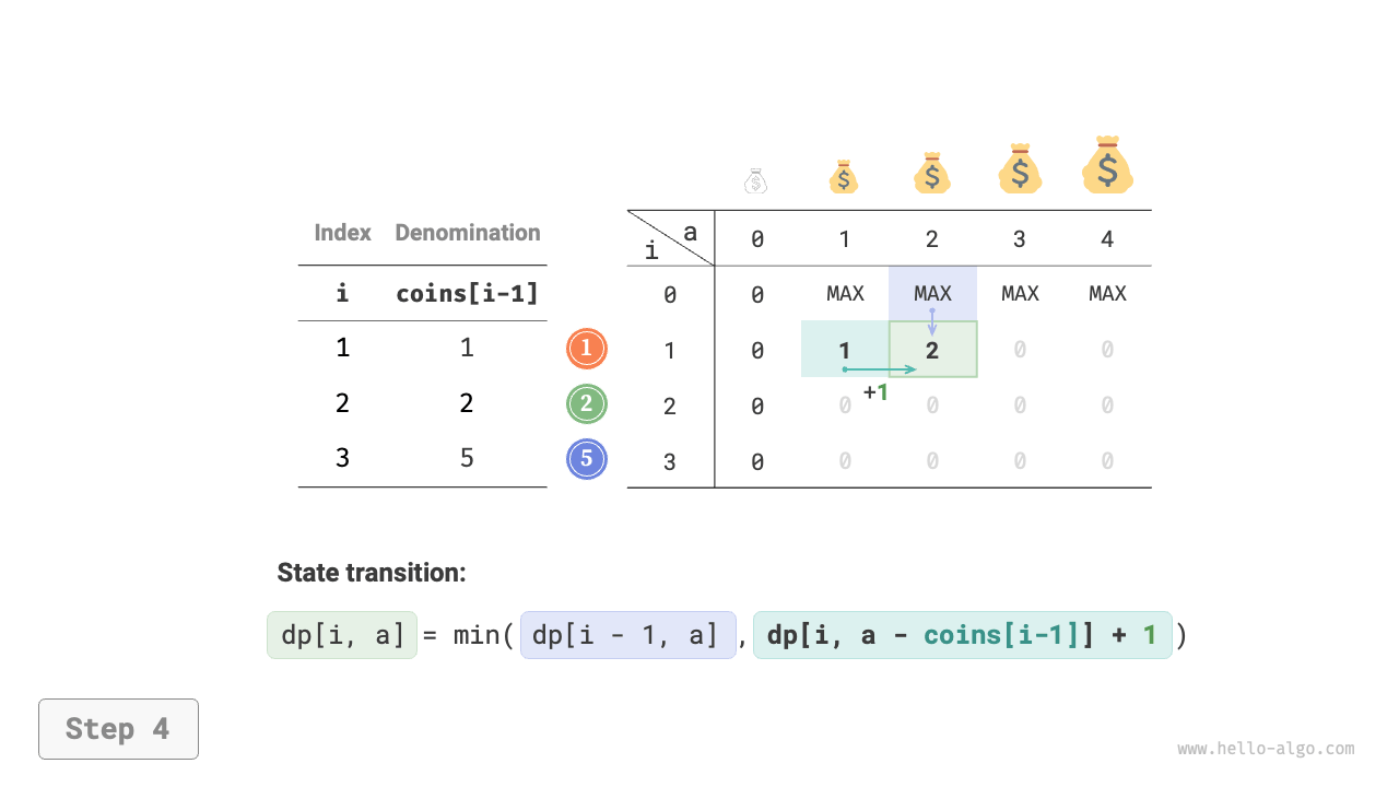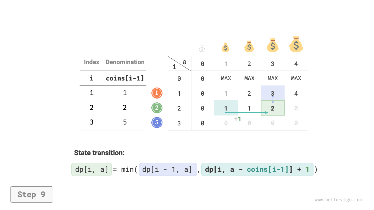 - The optimization is focused on the number of coins, so simply add \(+1\) when a coin is chosen.