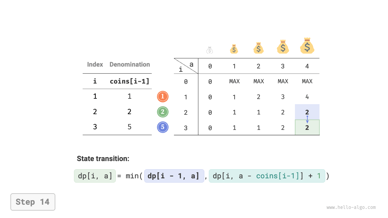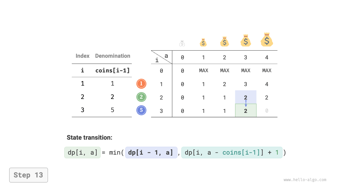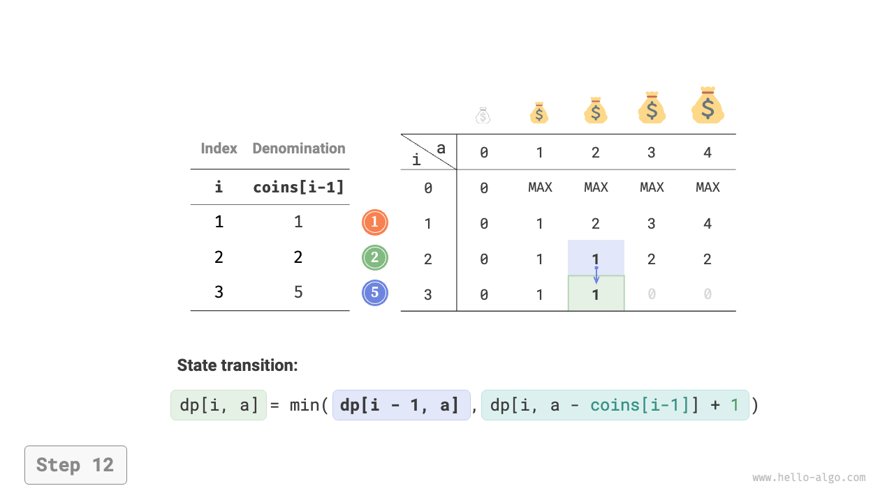 dp[i][a] = Math.min(dp[i - 1][a], dp[i][a - coins[i - 1]] + 1);