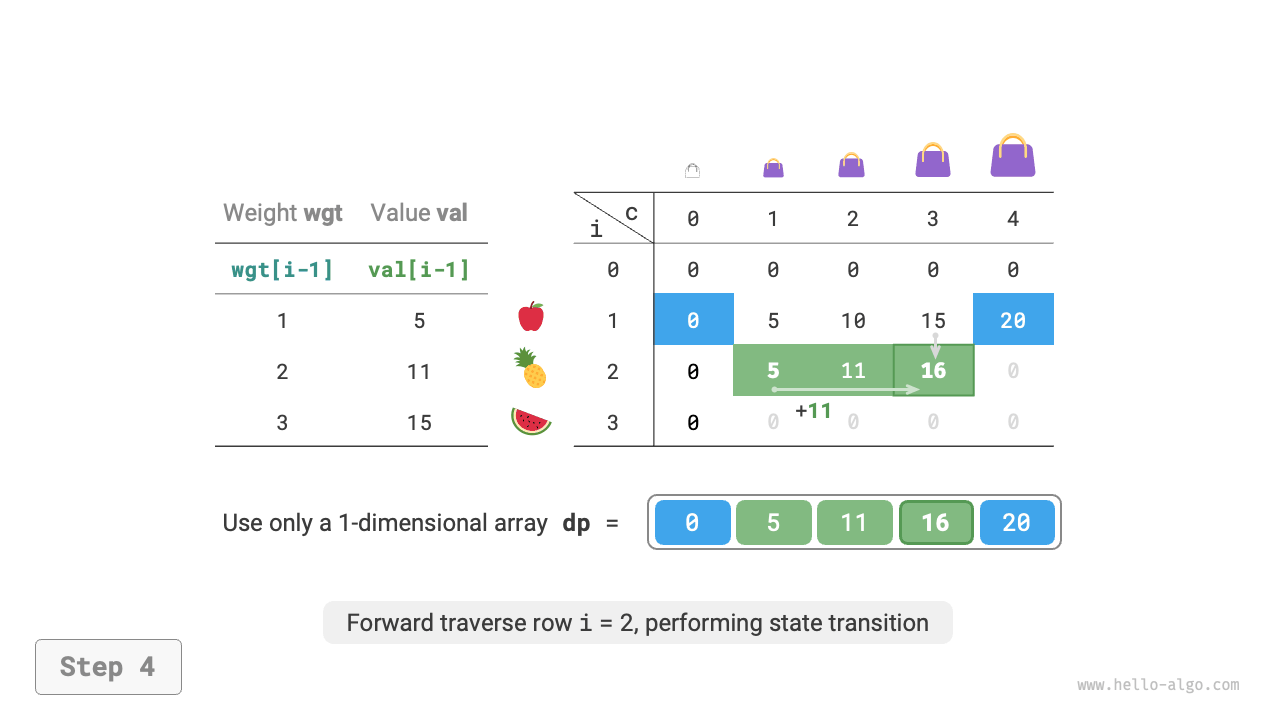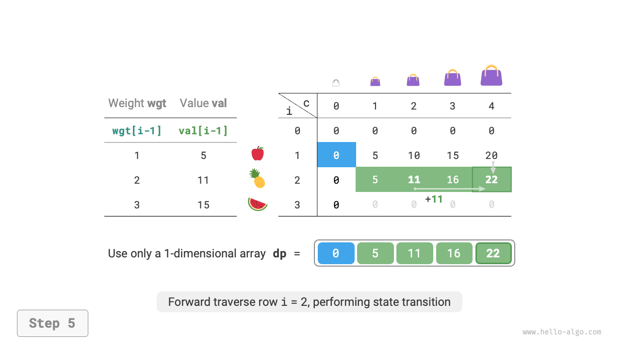 Figure 14-23 Dynamic programming process for the unbounded knapsack problem after space optimization