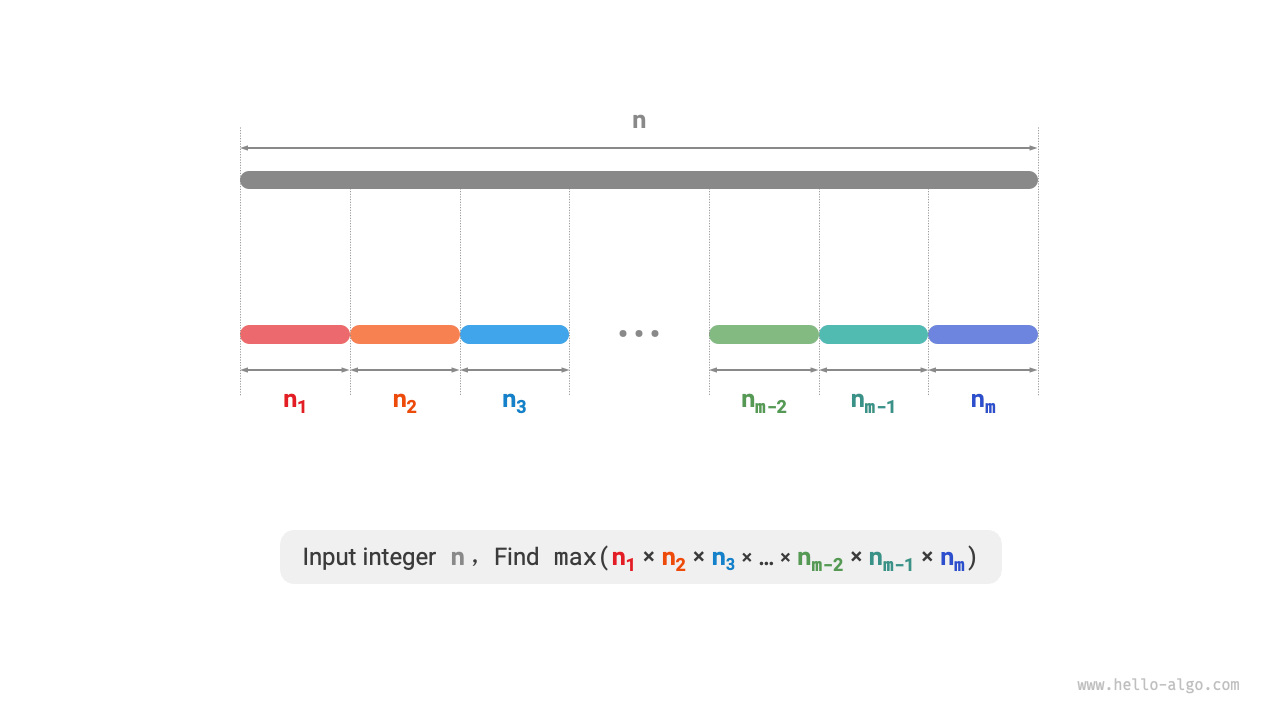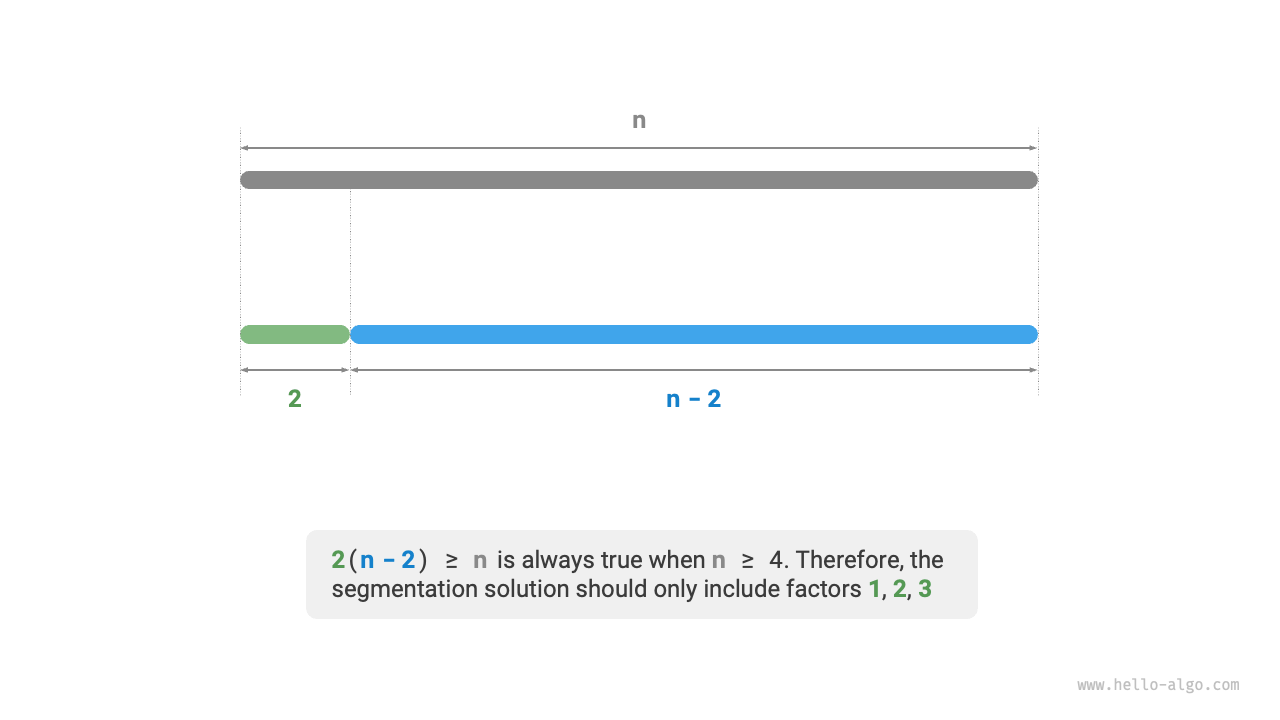 - The splitting scheme does not contain \(1\): Assume the optimal splitting scheme includes a factor of \(1\), then it can definitely be merged into another factor to obtain a larger product. This contradicts the assumption.