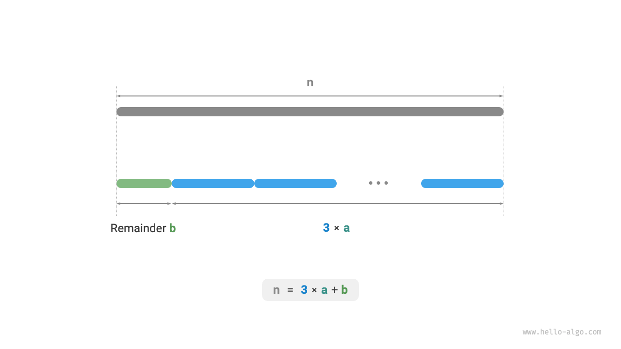 As shown in Figure 15-16, we do not need to use loops to split the integer but can use the floor division operation to get the number of \(3\)s, \(a\), and the modulo operation to get the remainder, \(b\), thus: