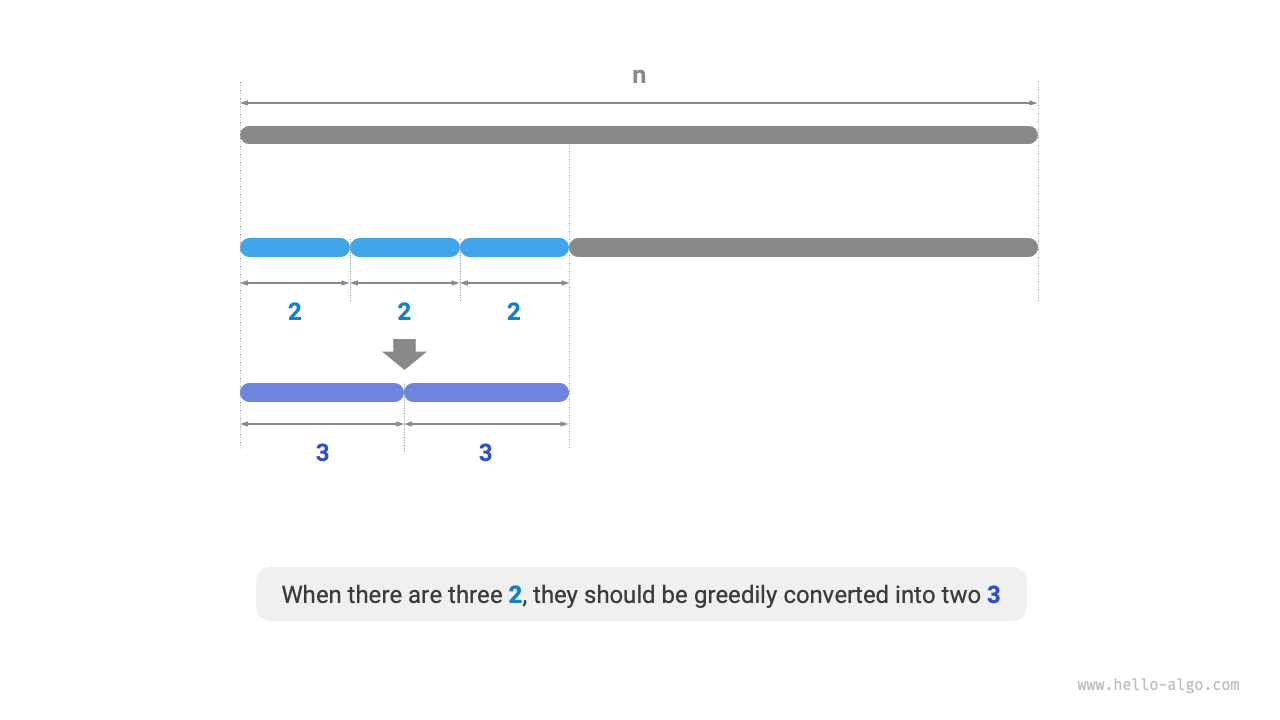Greedy strategy two: In the splitting scheme, there should be at most two \(2\)s. Because three \(2\)s can always be replaced by two \(3\)s to obtain a higher product.