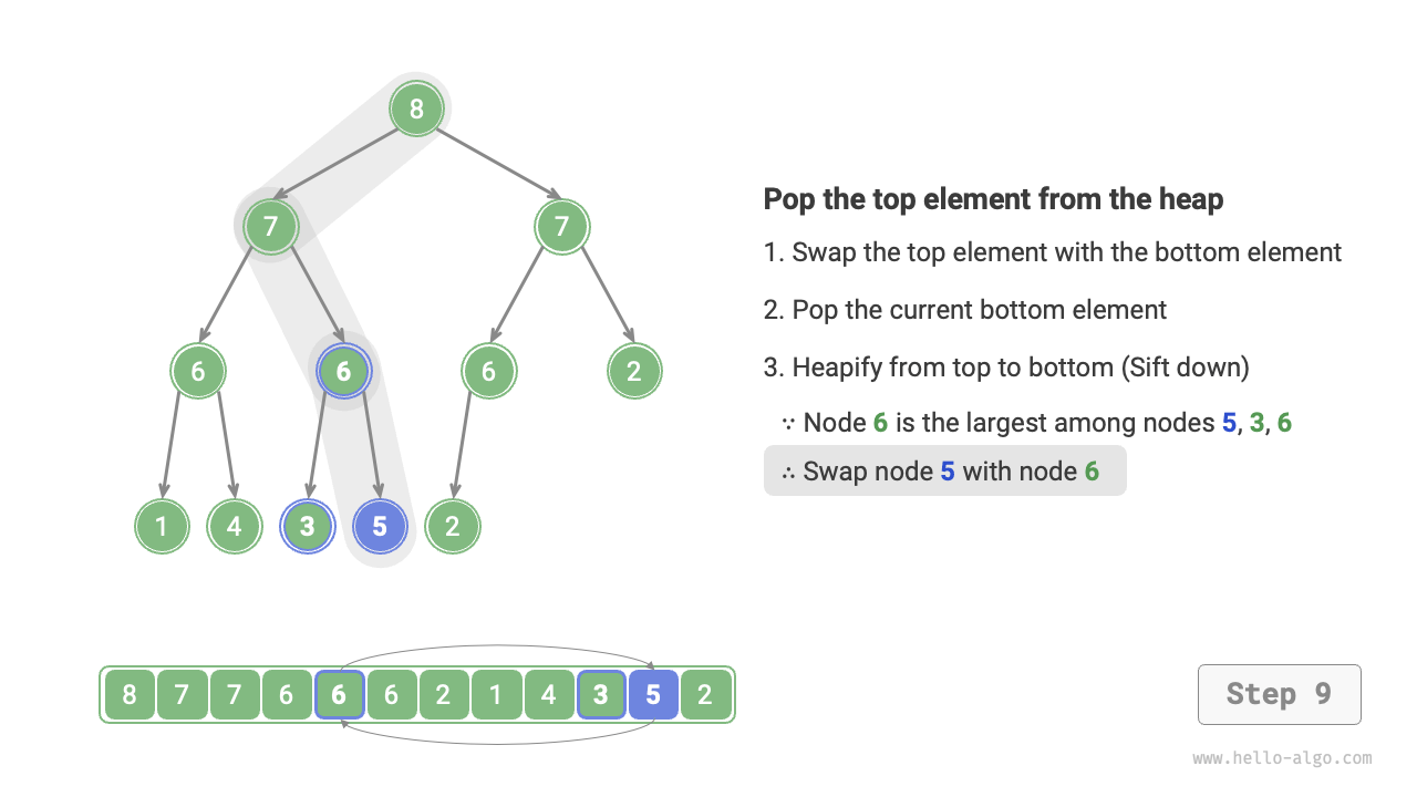 The top element of the heap is the root node of the binary tree, that is, the first element of the list. If we directly remove the first element from the list, all node indexes in the binary tree would change, making it difficult to use heapify for repairs subsequently. To minimize changes in element indexes, we use the following steps.