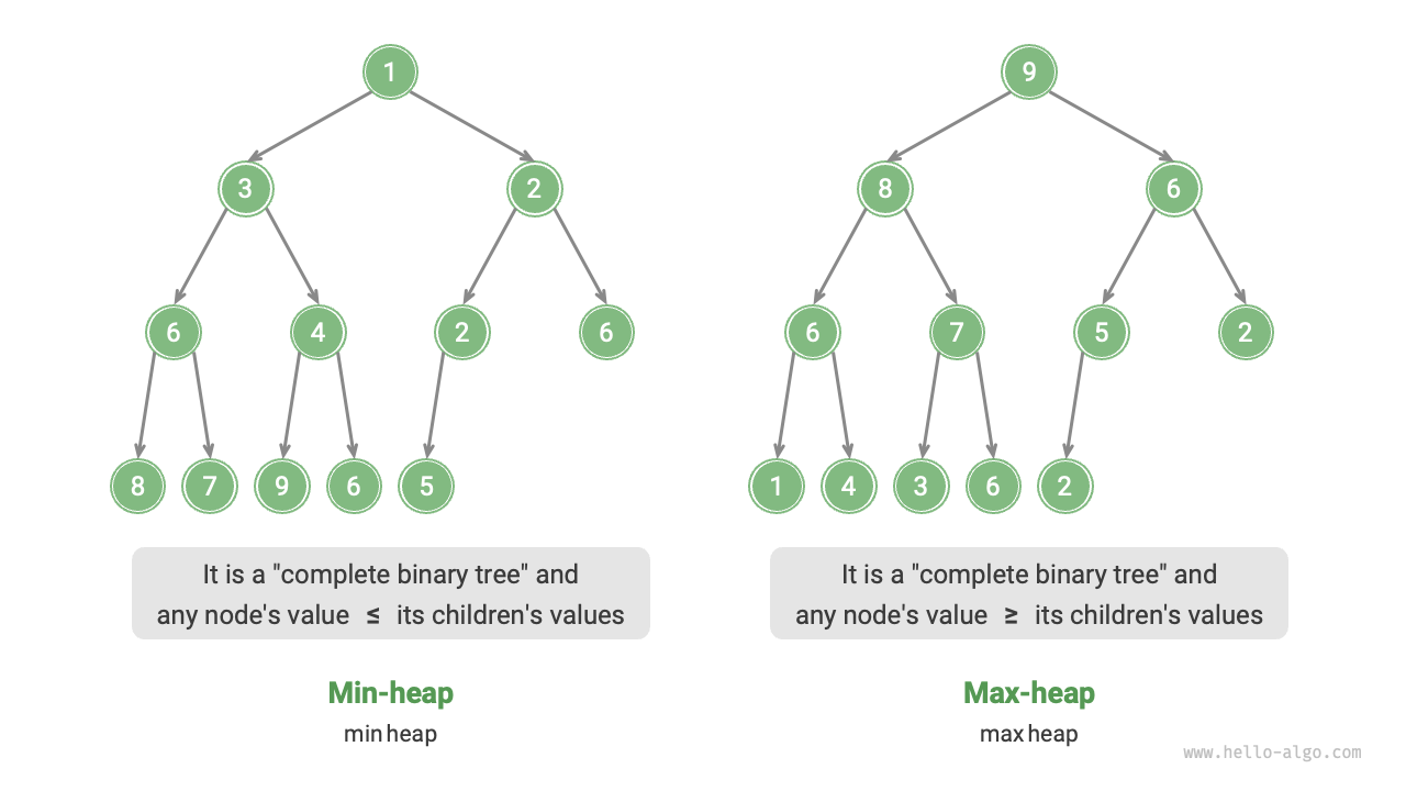 A heap is a complete binary tree that satisfies specific conditions and can be mainly divided into two types, as shown in Figure 8-1.