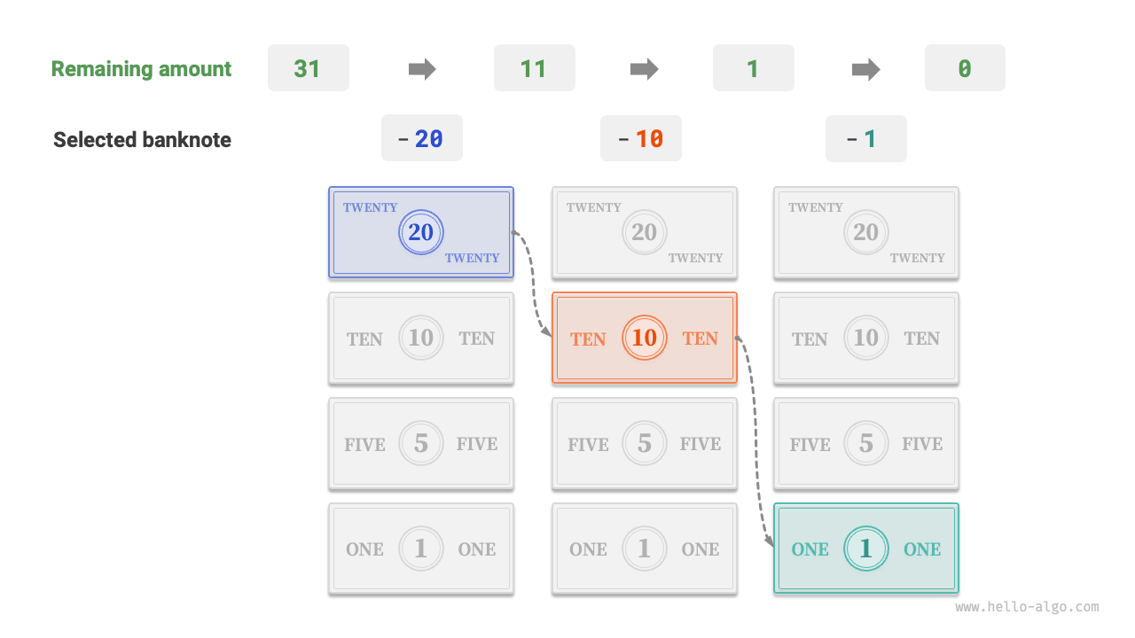 In the above steps, we make the best choice at each step (using the largest denomination possible), ultimately resulting in a feasible change-making plan. From the perspective of data structures and algorithms, this method is essentially a "Greedy" algorithm.