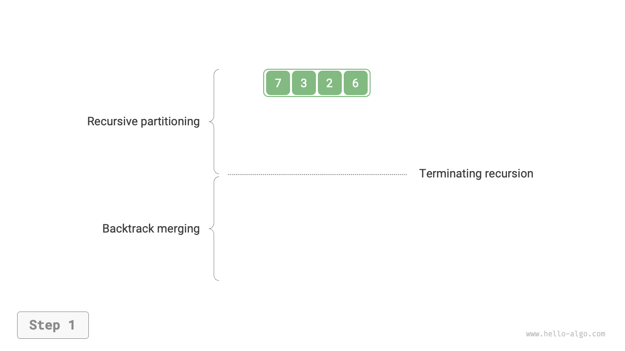 - Divide phase: Recursively split the array from the midpoint, transforming the sorting problem of a long array into that of shorter arrays.