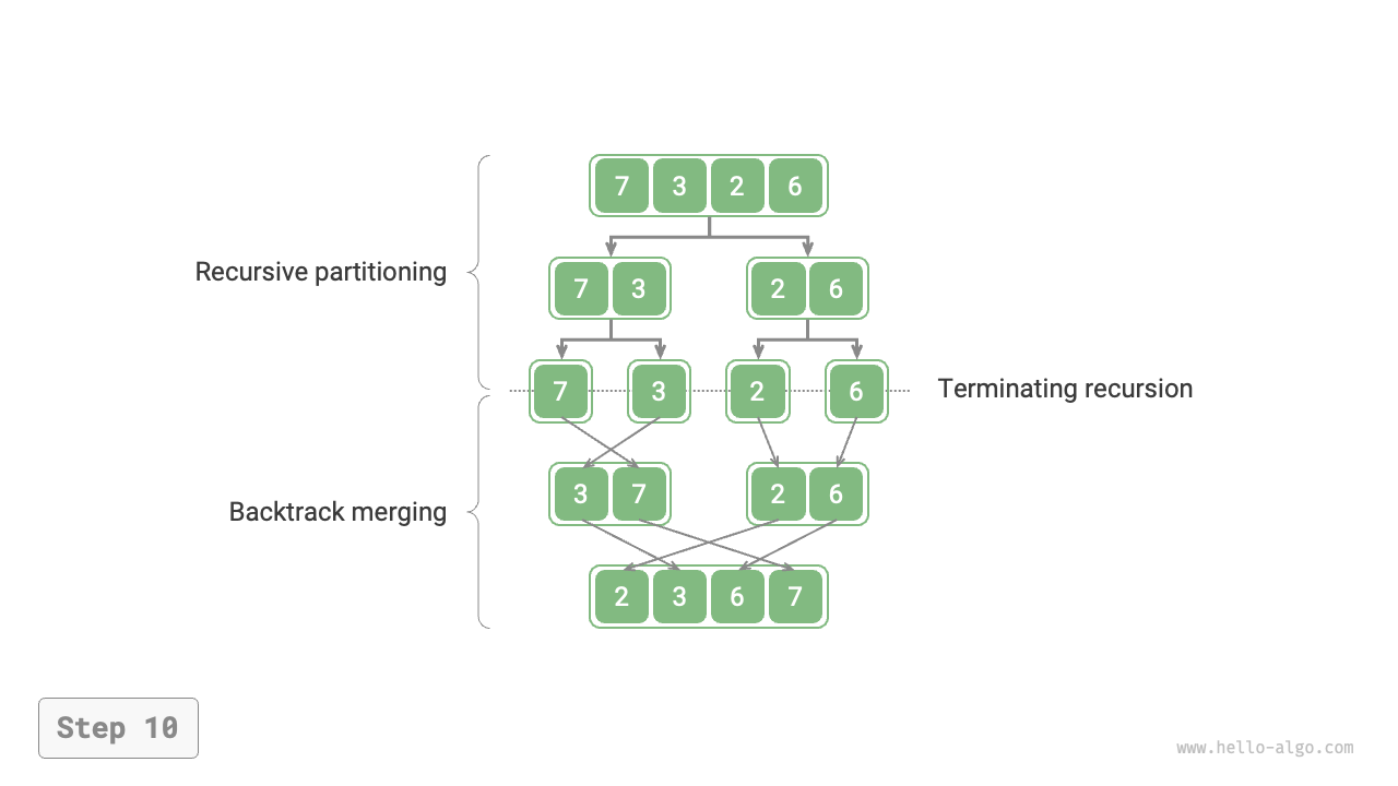 - Space complexity of \(O(n)\), non-in-place sort: The recursion depth is \(\log n\), using \(O(\log n)\) stack frame space. The merging operation requires auxiliary arrays, using an additional space of \(O(n)\).