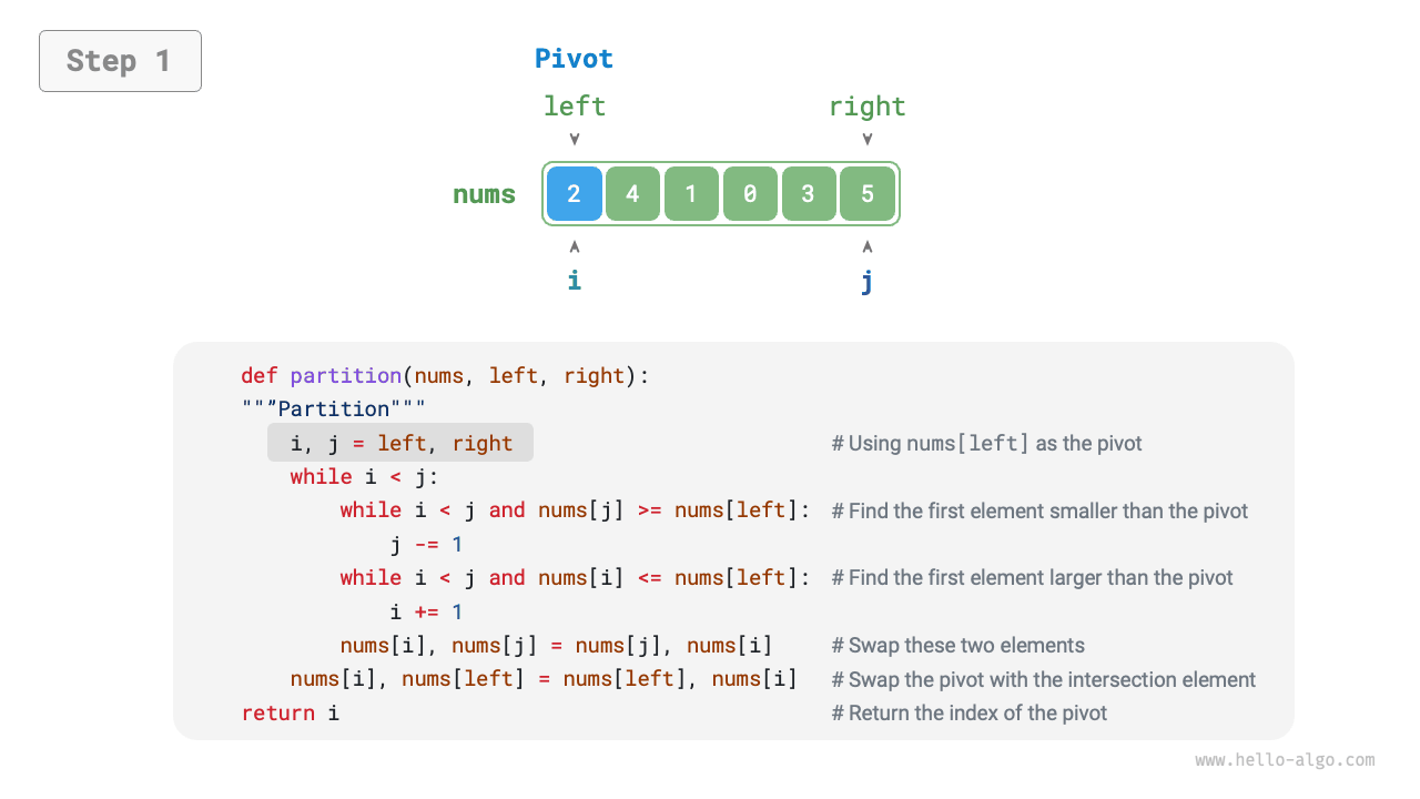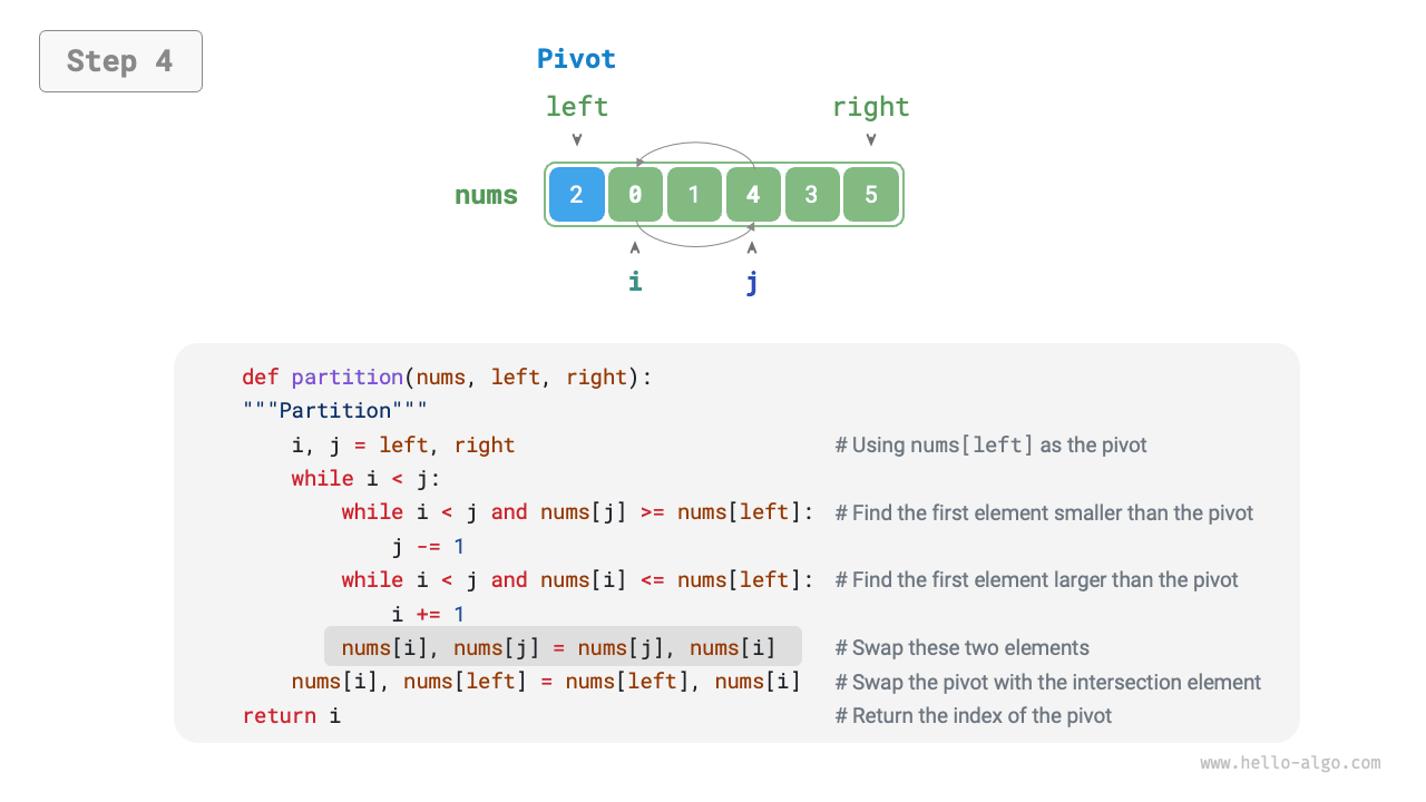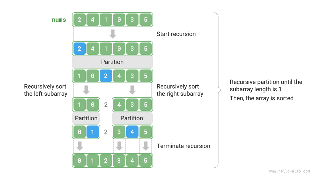 - Time complexity of \(O(n \log n)\), non-adaptive sorting: In average cases, the recursive levels of pivot partitioning are \(\log n\), and the total number of loops per level is \(n\), using \(O(n \log n)\) time overall. In the worst case, each round of pivot partitioning divides an array of length \(n\) into two sub-arrays of lengths \(0\) and \(n - 1\), reaching \(n\) recursive levels, and using \(O(n^2)\) time overall.