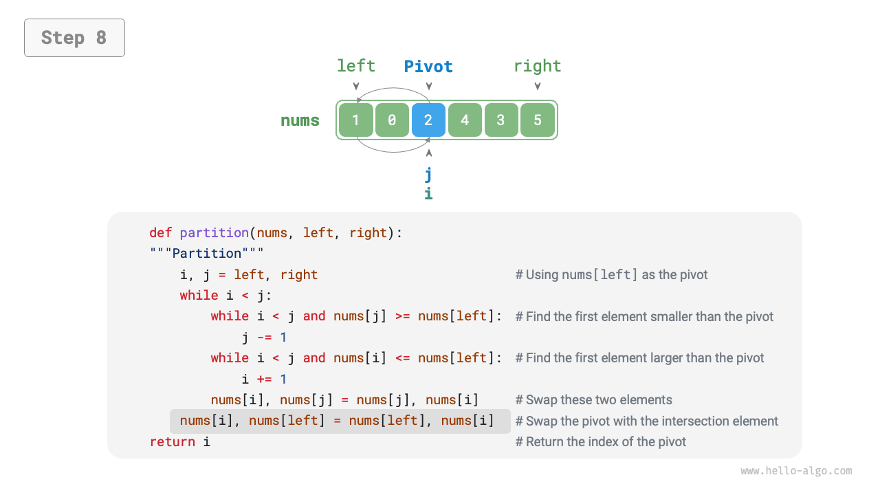 2.untiliandjmeet, finally swap the pivot to the boundary between the two sub-arrays.