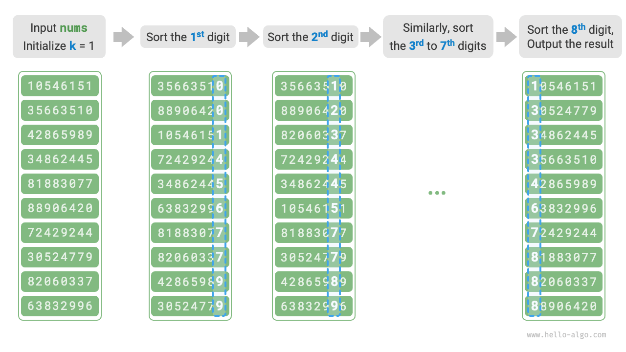- Time complexity is \(O(nk)\), non-adaptive sorting: Assuming the data size is \(n\), the data is in base \(d\), and the maximum number of digits is \(k\), then sorting a single digit takes \(O(n + d)\) time, and sorting all \(k\) digits takes \(O((n + d)k)\) time. Generally, both \(d\) and \(k\) are relatively small, leading to a time complexity approaching \(O(n)\).