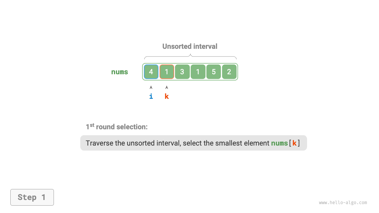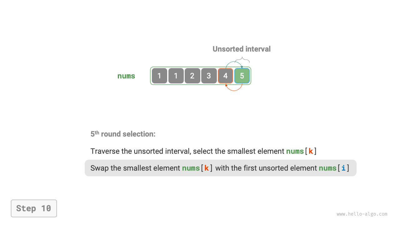 In the code, we use \(k\) to record the smallest element within the unsorted interval: