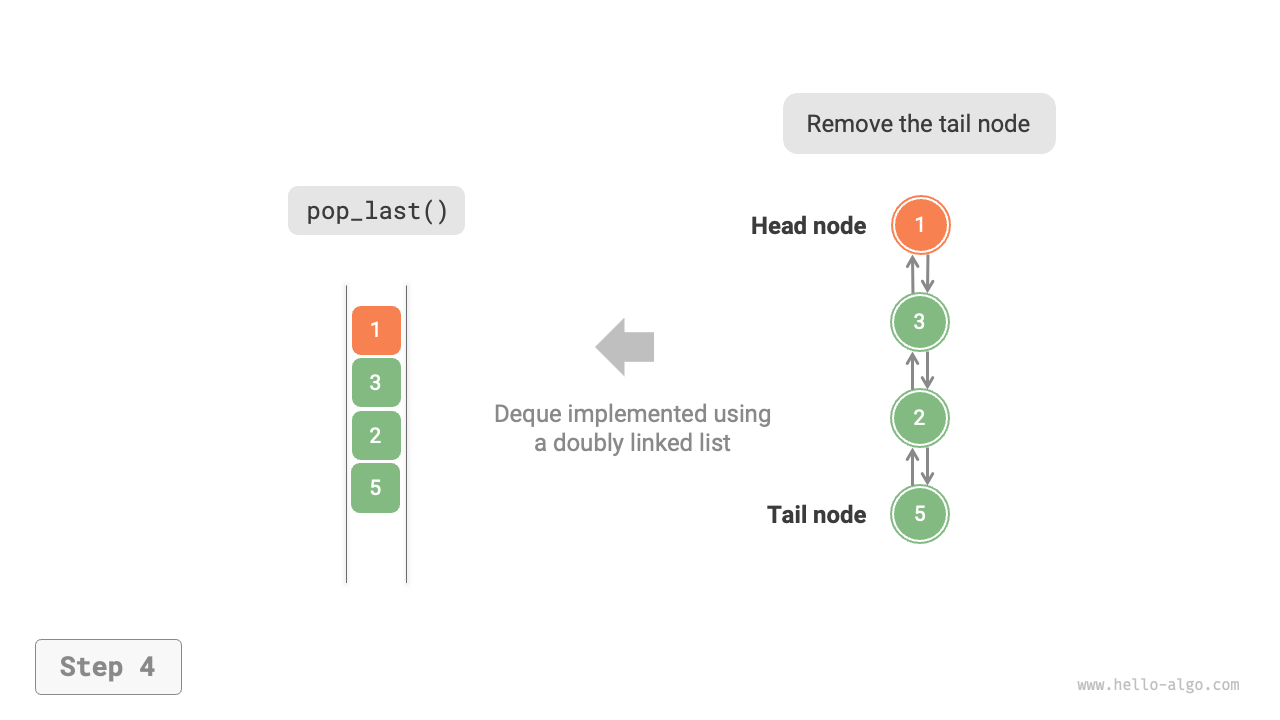 In a queue, we can only delete elements from the head or add elements to the tail. As shown in Figure 5-7, a double-ended queue (deque) offers more flexibility, allowing the addition or removal of elements at both the head and the tail.