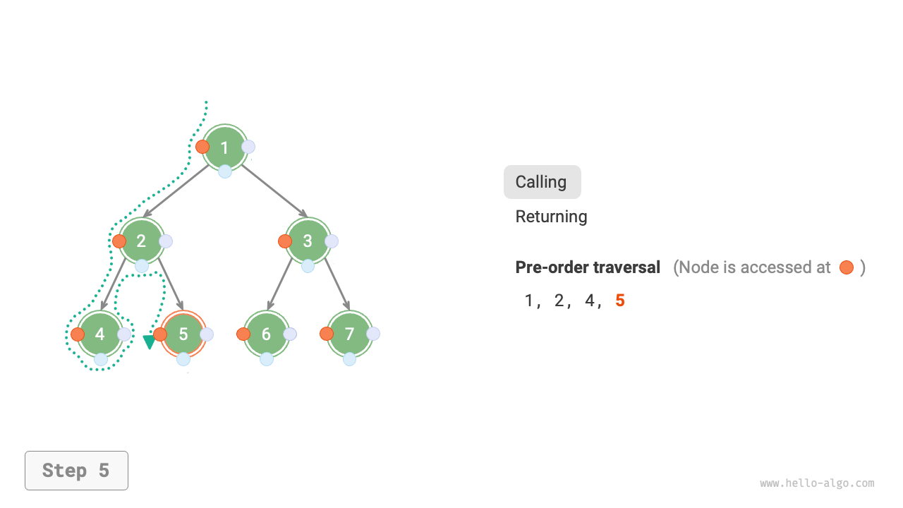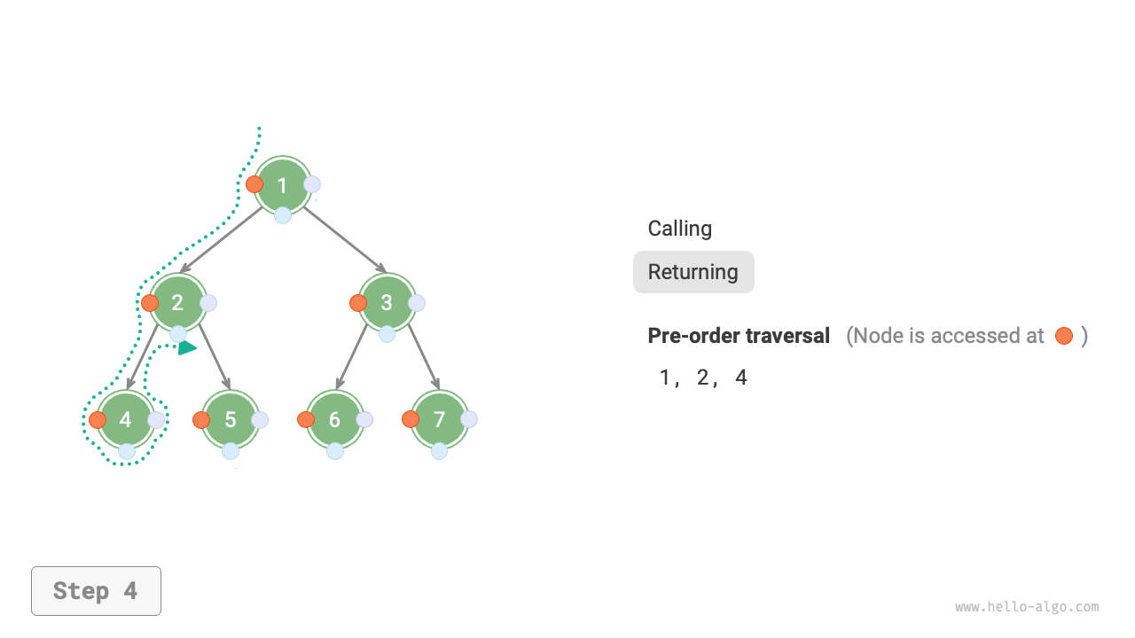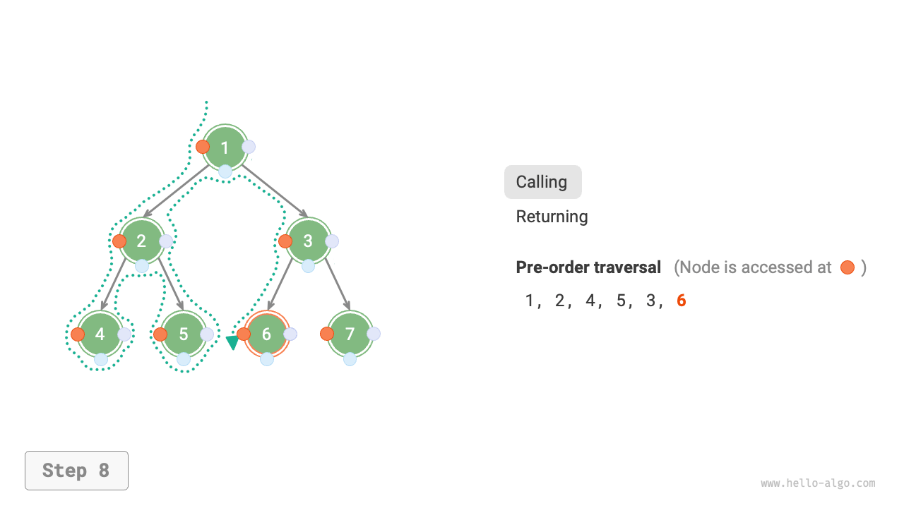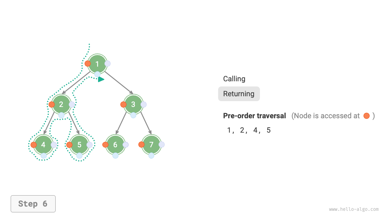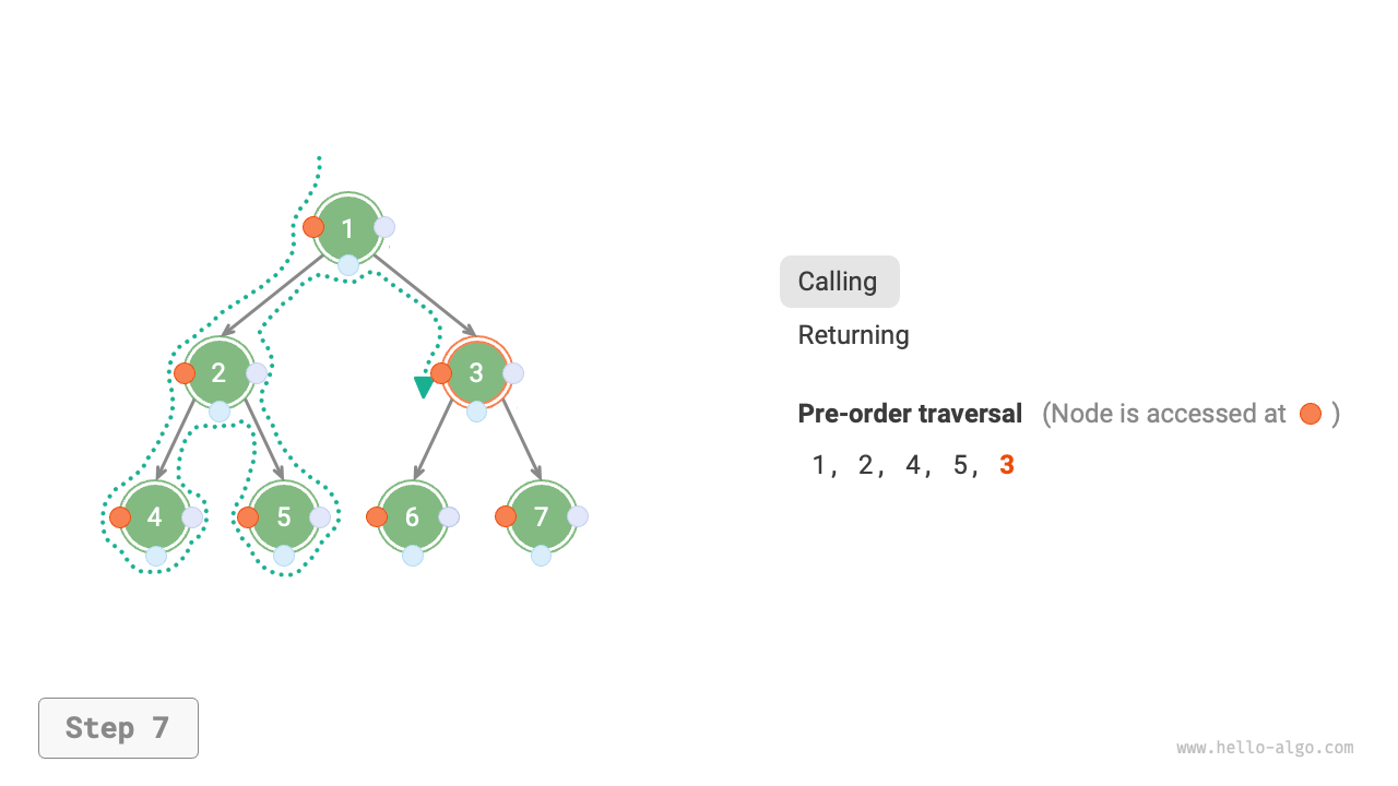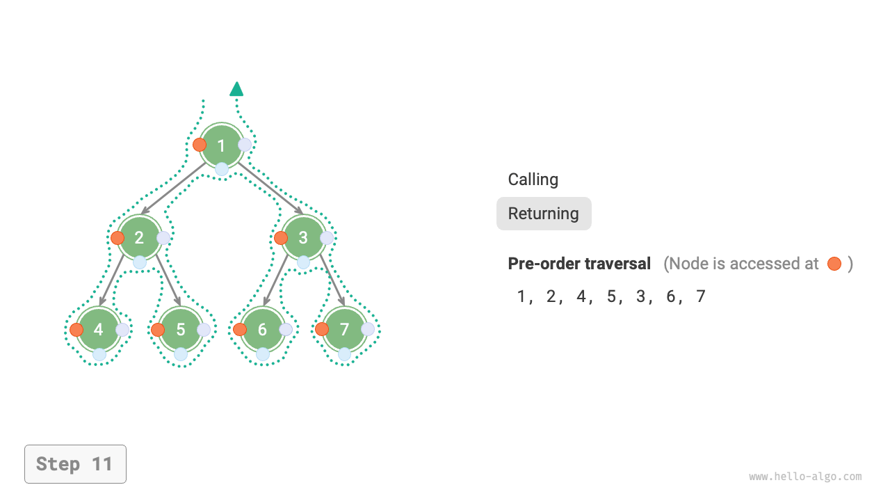 Figure 7-11 shows the recursive process of pre-order traversal of a binary tree, which can be divided into two opposite parts: "recursion" and "return".