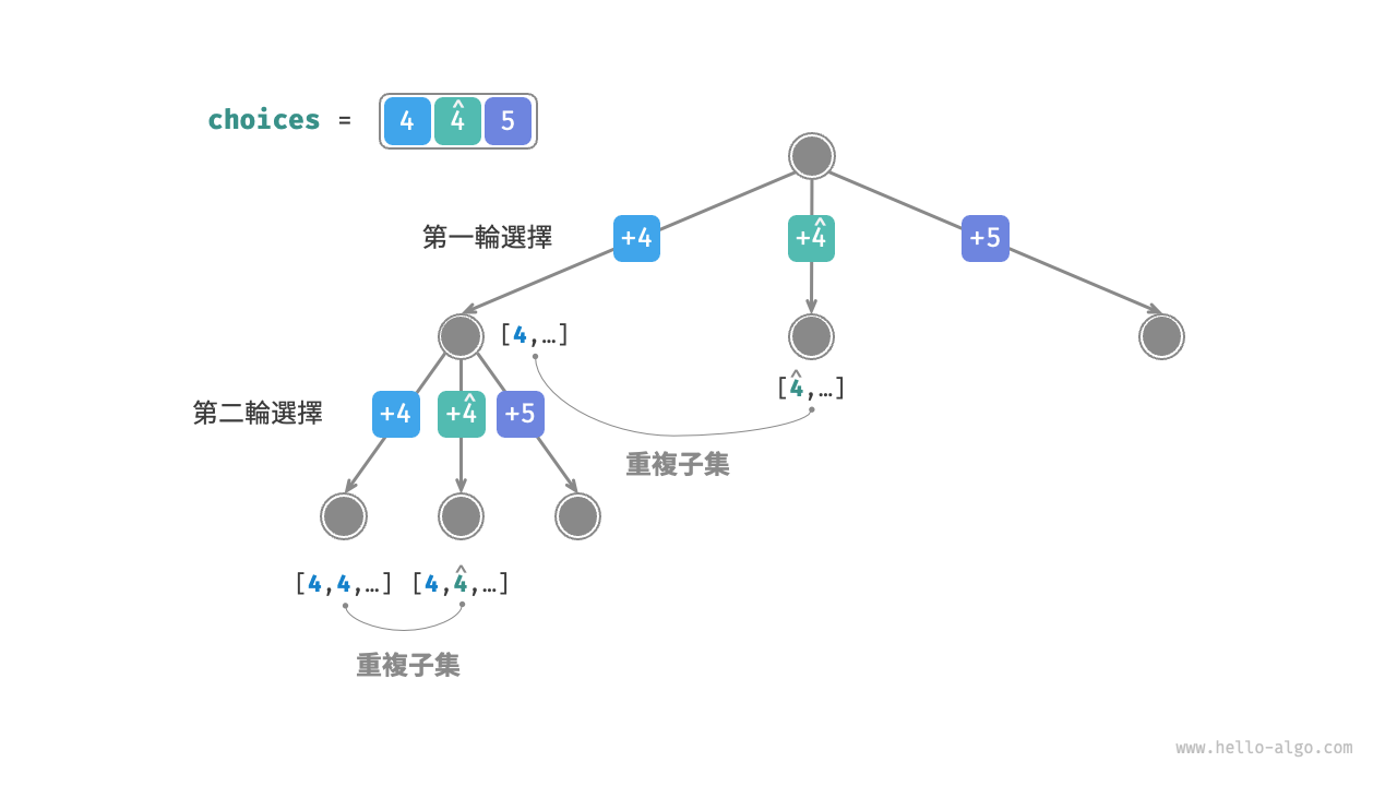 相比於上題,本題的輸入陣列可能包含重複元素,這引入了新的問題。例如,給定陣列 \([4, \hat{4}, 5]\) 和目標元素 \(9\) ,則現有程式碼的輸出結果為 \([4, 5], [\hat{4}, 5]\) ,出現了重複子集。
