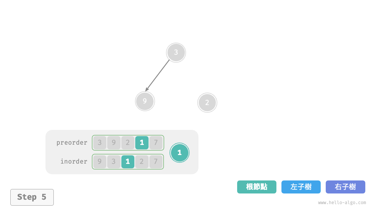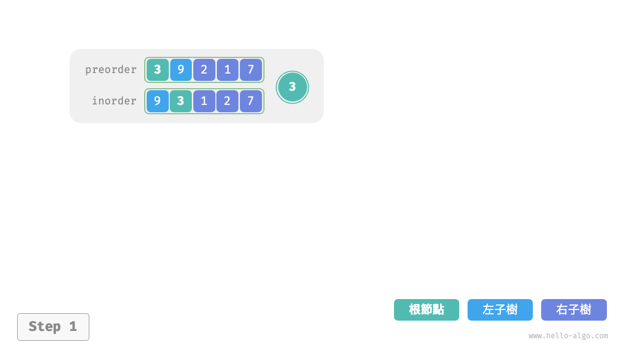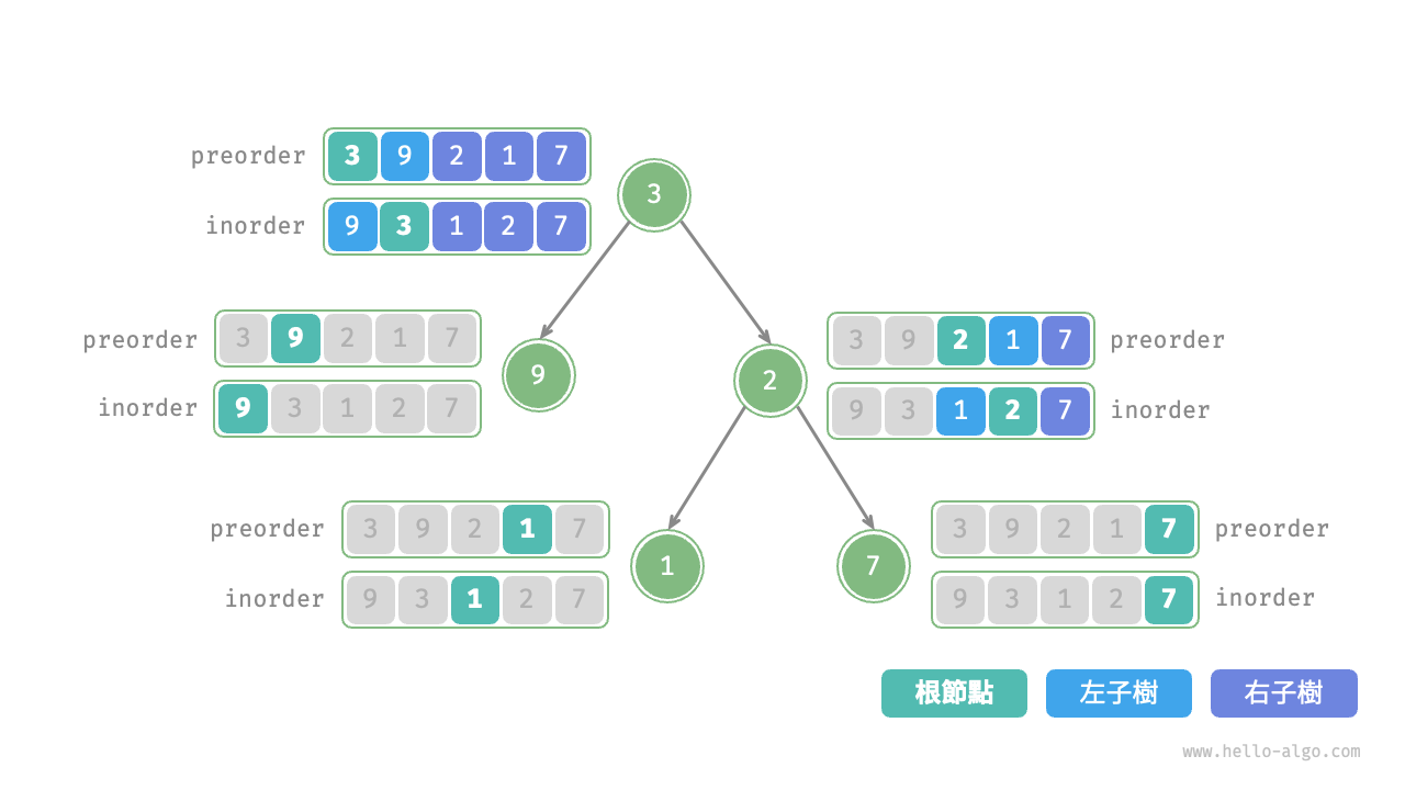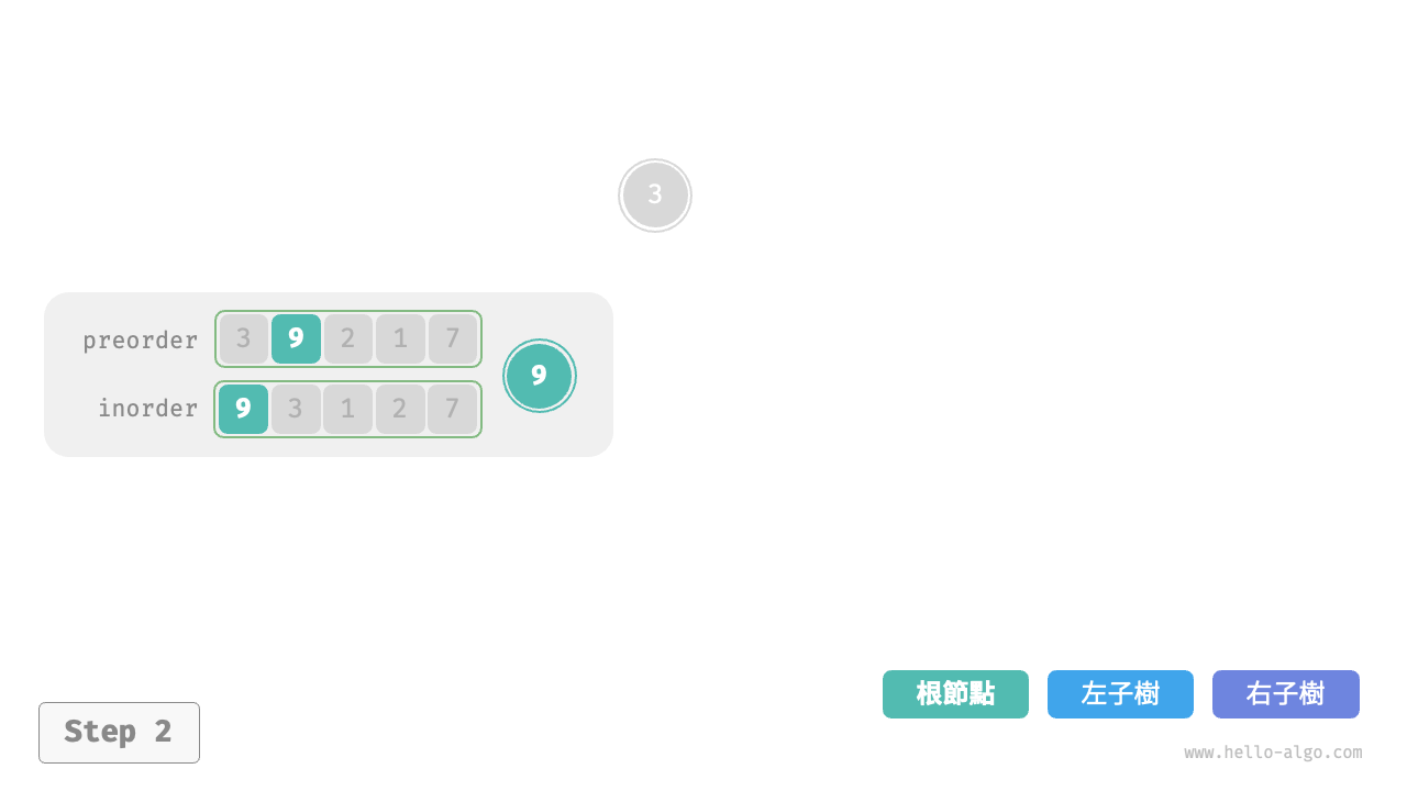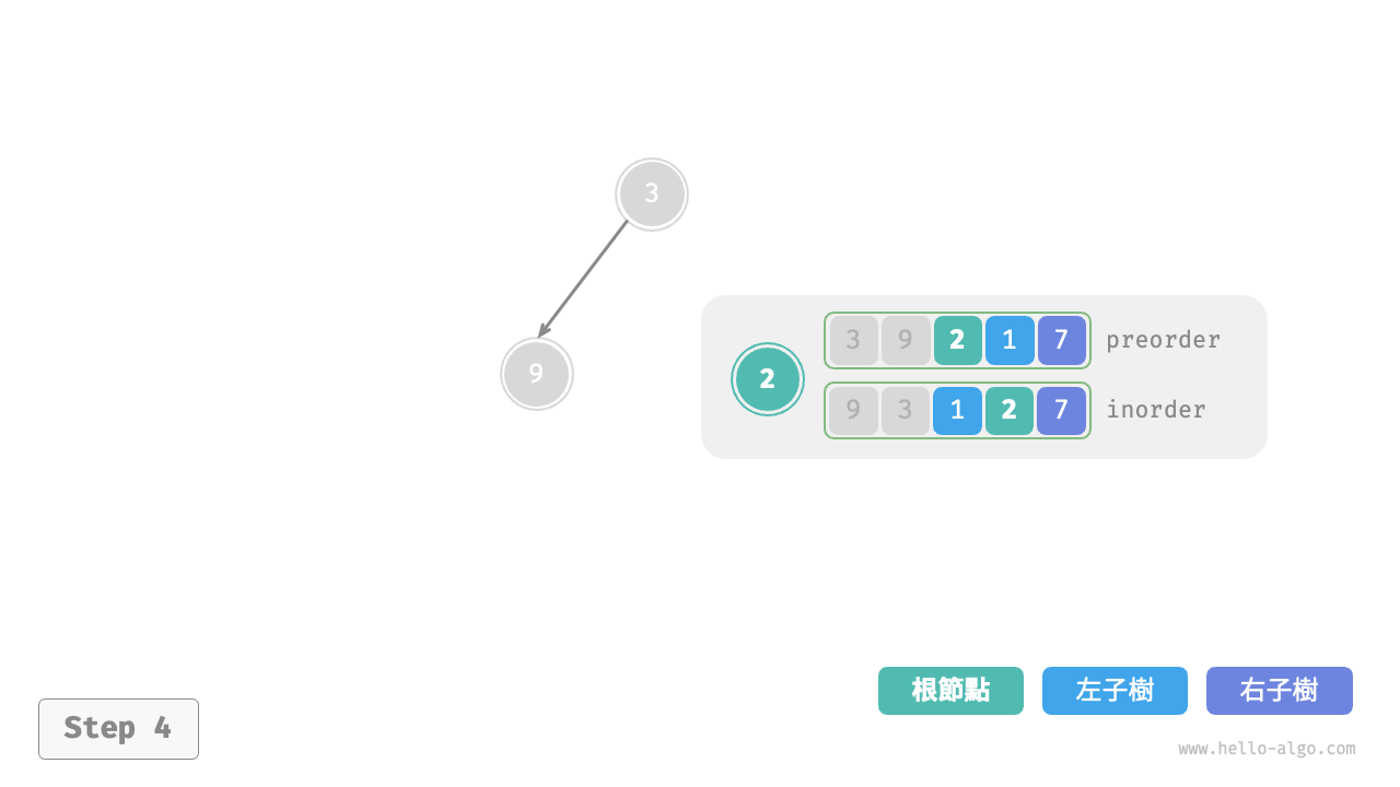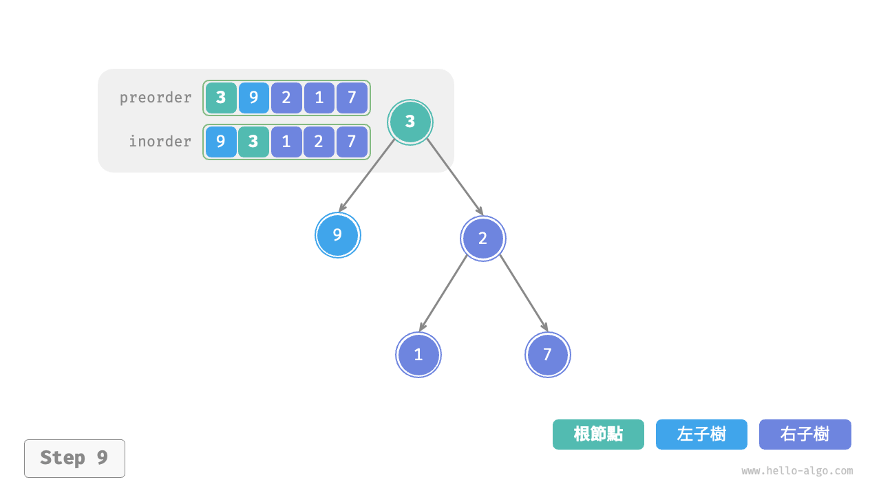 inorder的劃分結果,易得左子樹和右子樹的節點數量分別為 1 和 3 ,從而可將preorder劃分為[ 3 | 9 | 2 1 7 ]。