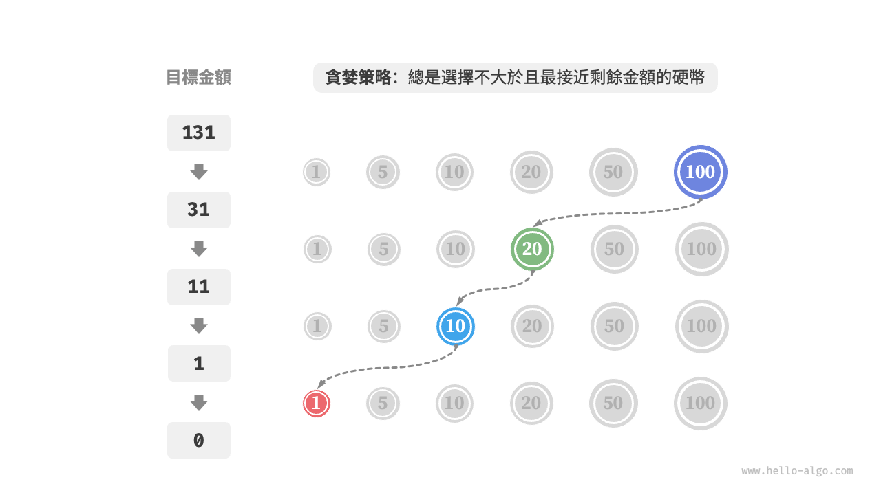 本題採取的貪婪策略如圖 15-1 所示。給定目標金額,我們貪婪地選擇不大於且最接近它的硬幣,不斷迴圈該步驟,直至湊出目標金額為止。