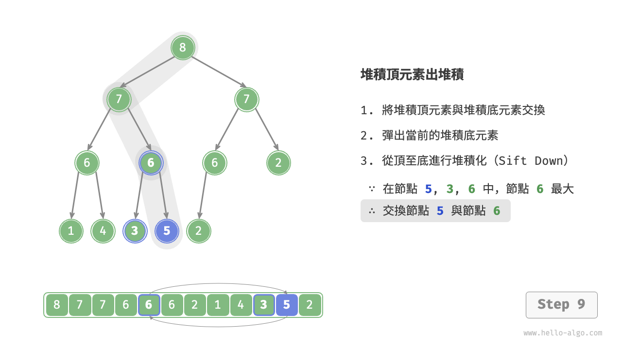 堆積頂元素出堆積 | \(O(\log n)\) |