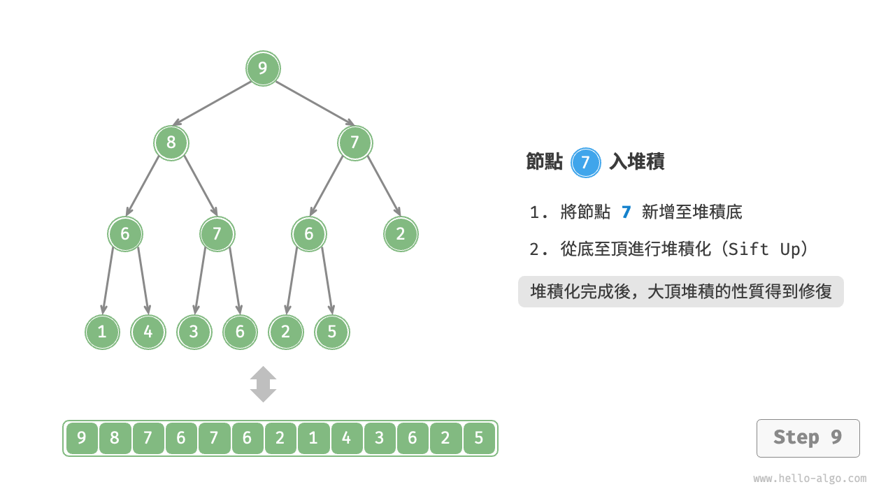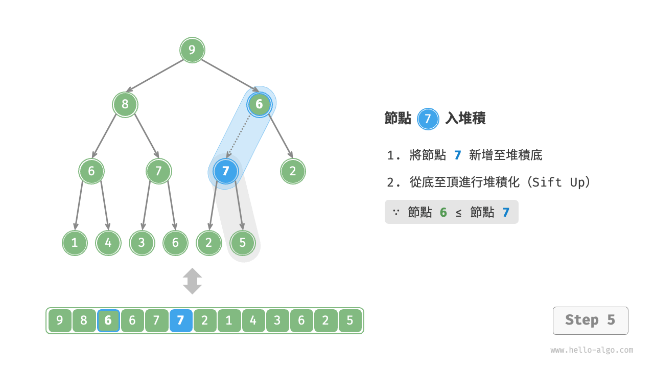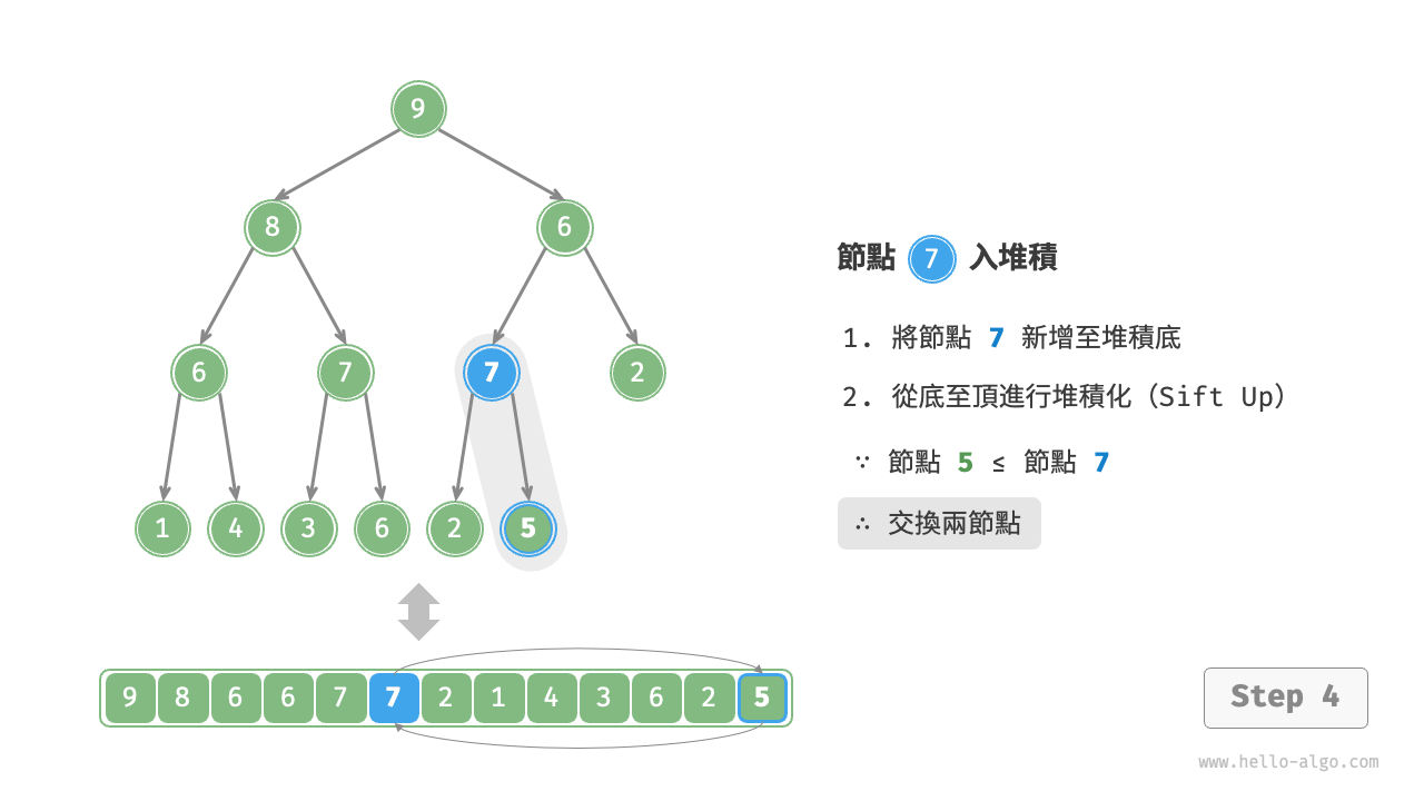 - 我們將二元樹的根節點稱為“堆積頂”,將底層最靠右的節點稱為“堆積底”。