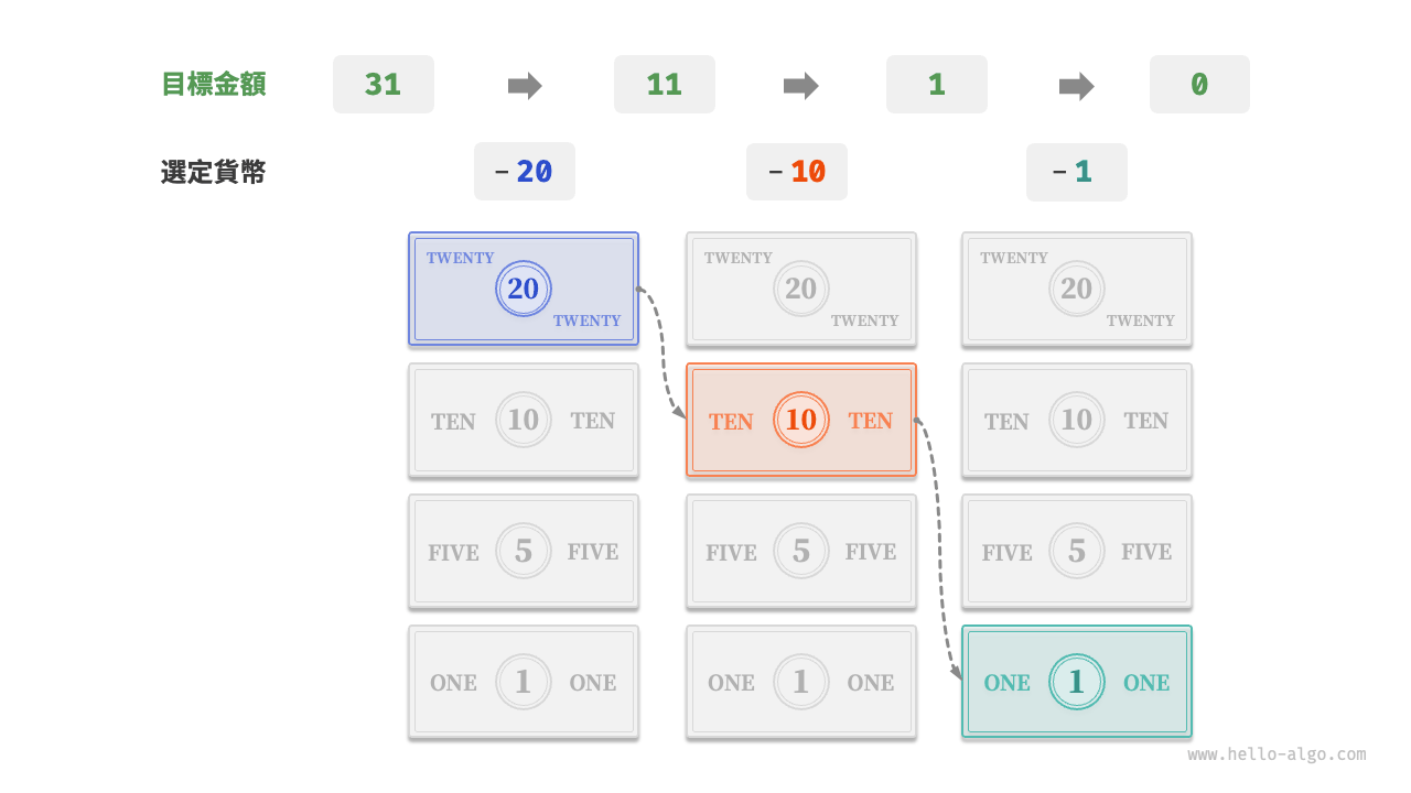 - 完成找零,方案為 \(20 + 10 + 1 = 31\) 元。
