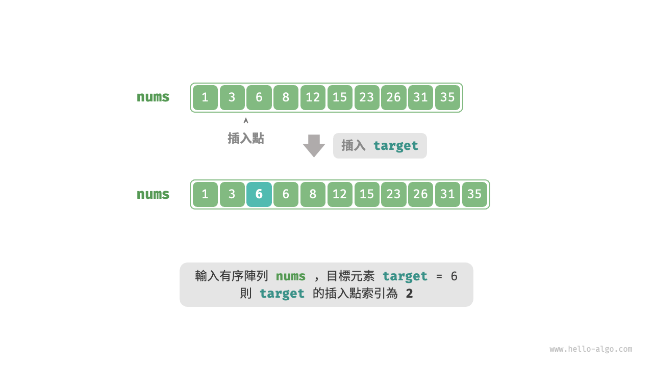 迴圈完成後,\(i\) 指向最左邊的 target ,\(j\) 指向首個小於 target 的元素,因此索引 \(i\) 就是插入點。