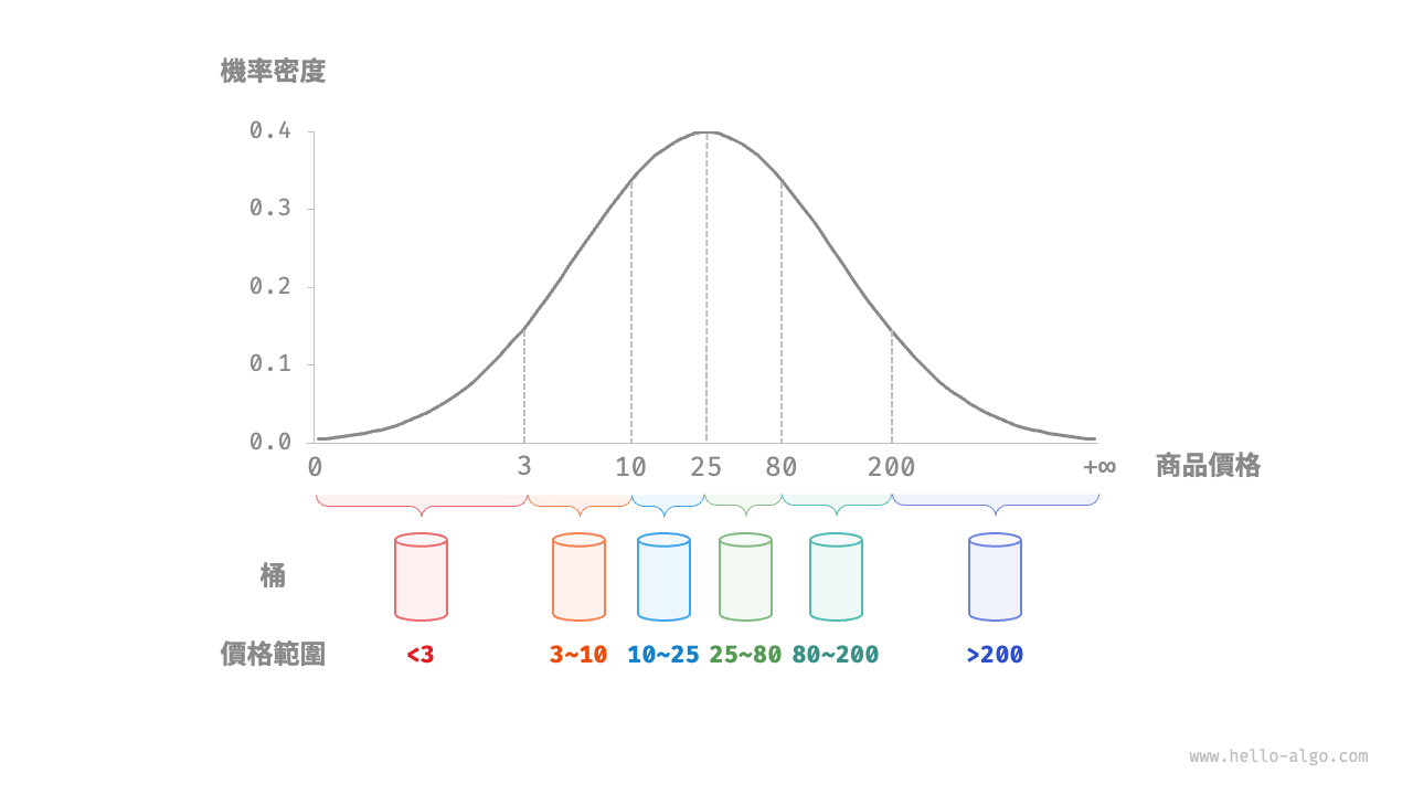 如圖 11-15 所示,我們假設商品價格服從正態分佈,這樣就可以合理地設定價格區間,從而將商品平均分配到各個桶中。