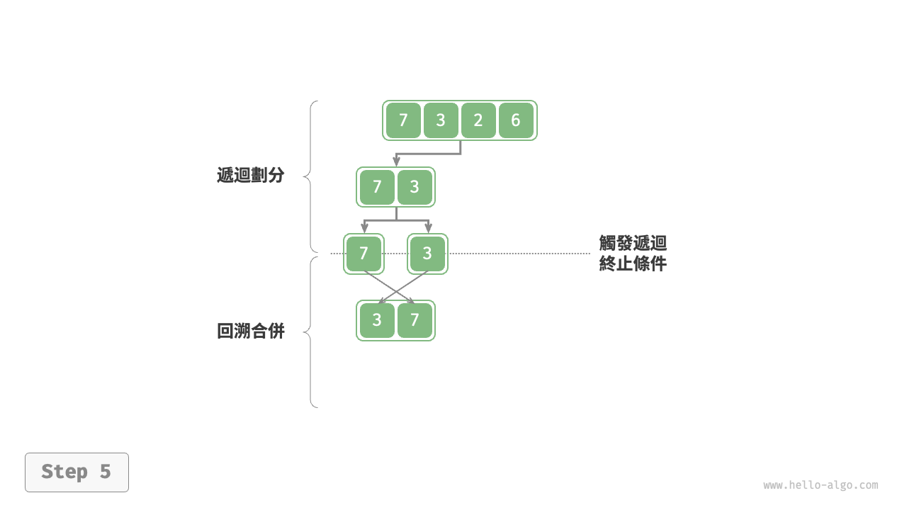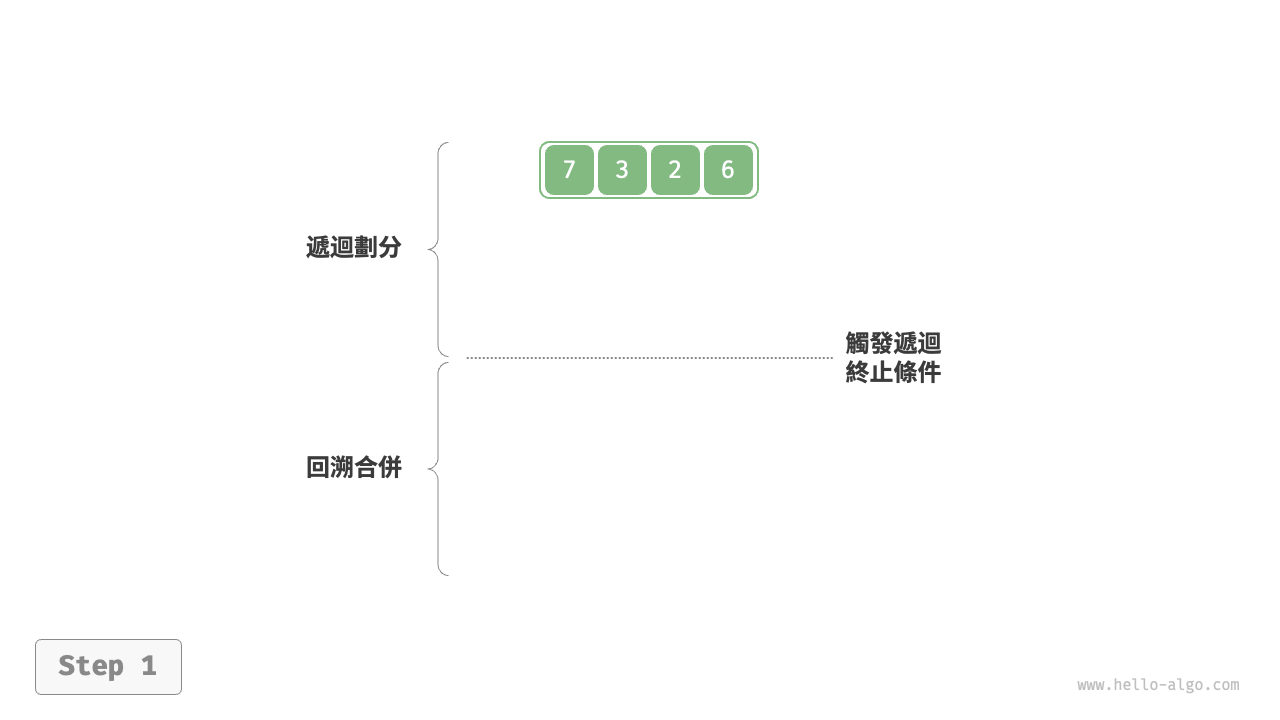- 劃分階段:透過遞迴不斷地將陣列從中點處分開,將長陣列的排序問題轉換為短陣列的排序問題。