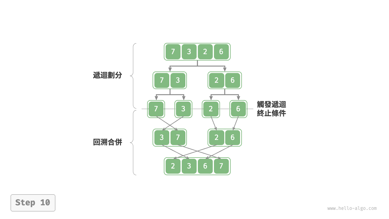 合併排序(merge sort)是一種基於分治策略的排序演算法,包含圖 11-10 所示的“劃分”和“合併”階段。