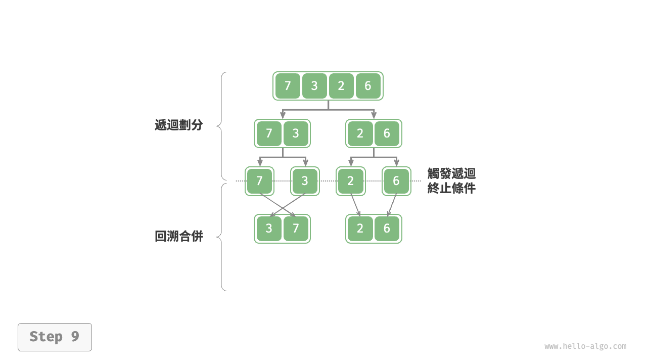 - 合併排序:先遞迴左子陣列,再遞迴右子陣列,最後處理合併。