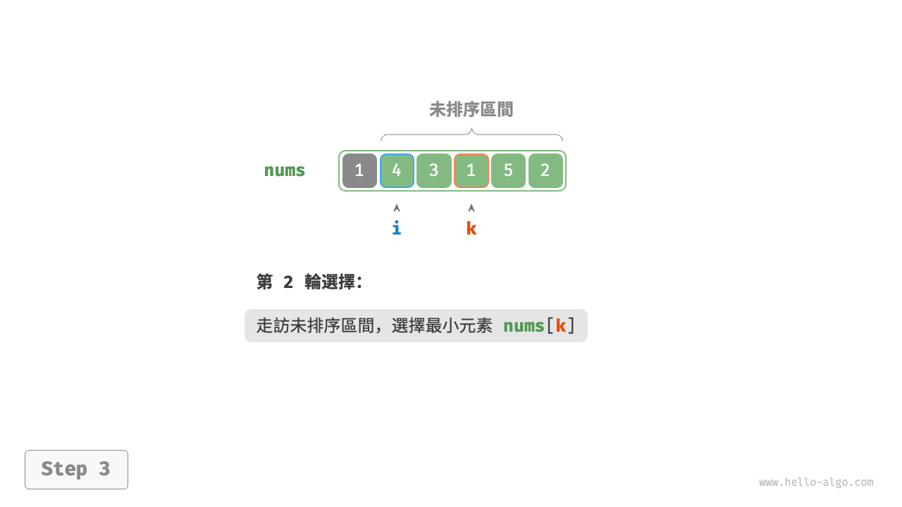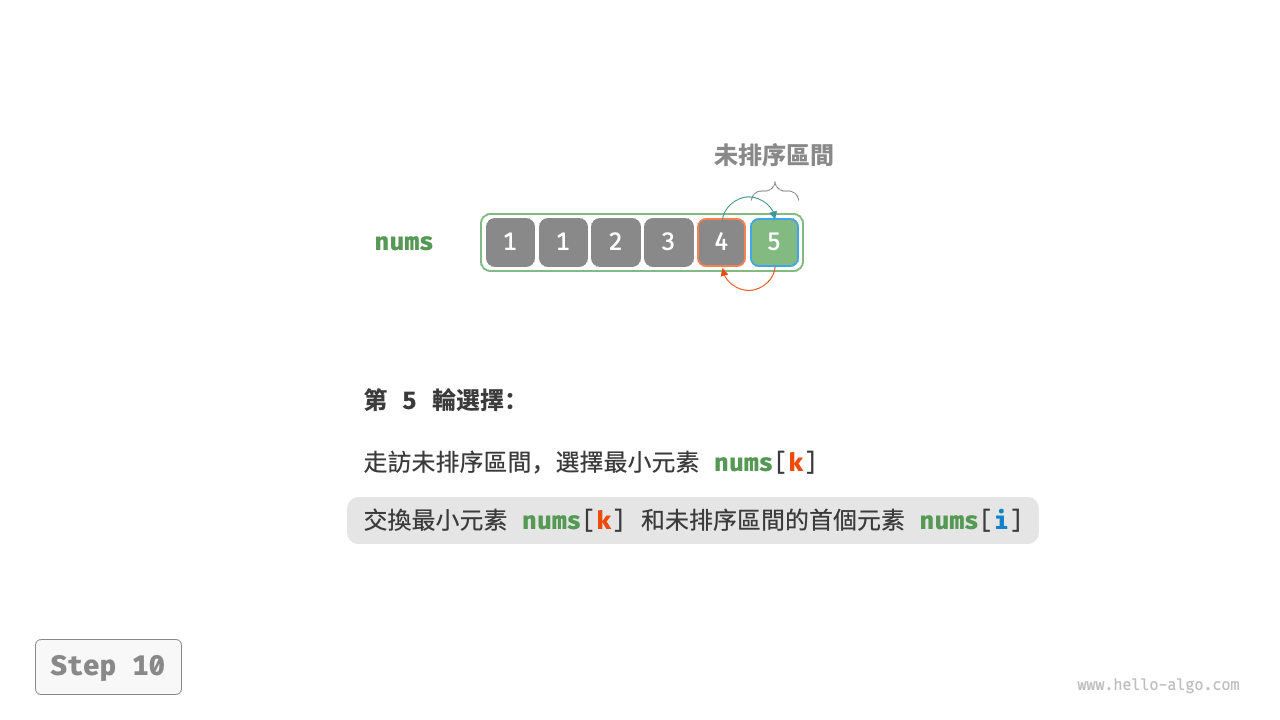 - 以此類推。經過 \(n - 1\) 輪選擇與交換後,陣列前 \(n - 1\) 個元素已排序。