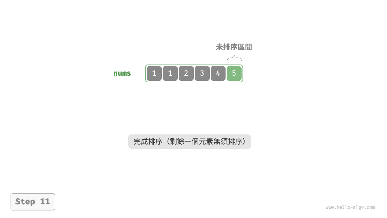 - 僅剩的一個元素必定是最大元素,無須排序,因此陣列排序完成。