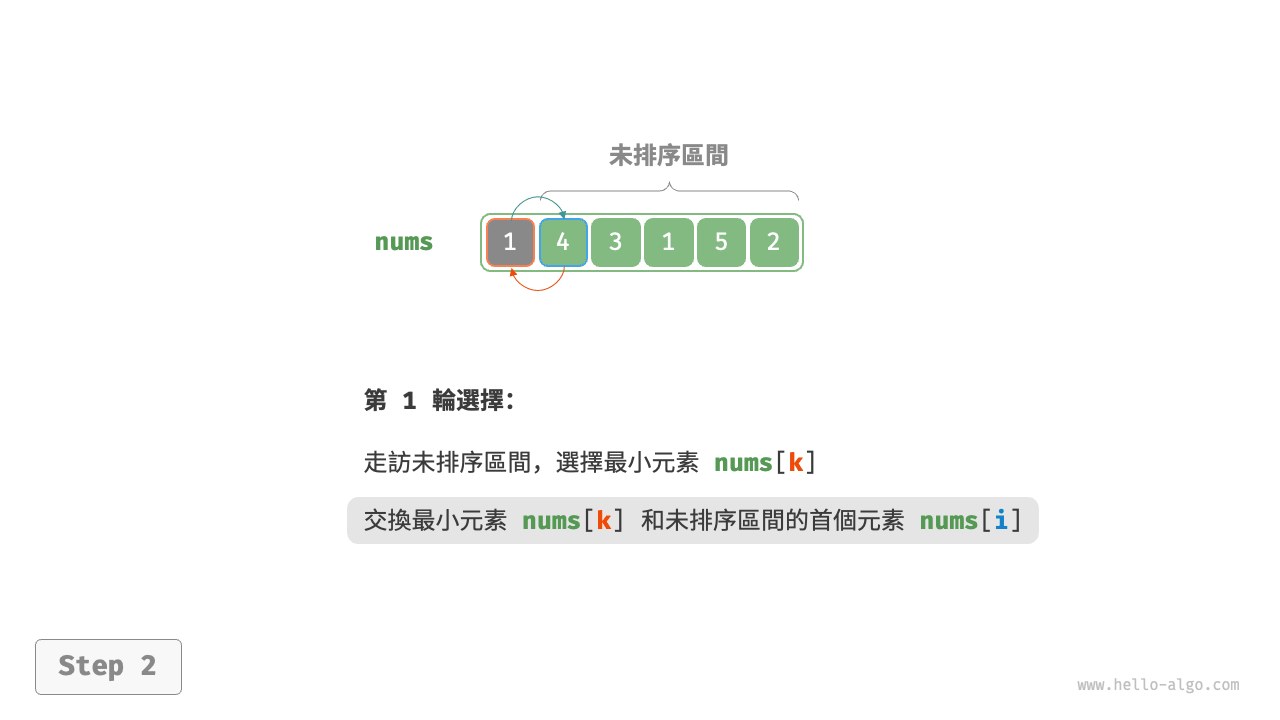 - 選取區間 \([1, n-1]\) 中的最小元素,將其與索引 \(1\) 處的元素交換。完成後,陣列前 2 個元素已排序。